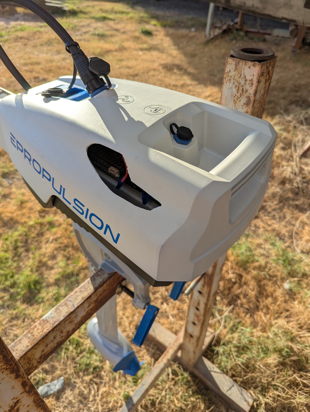 Leider klafft im Batterieteil des Außenborders ein großes Loch im Kunststoffgehäuse. Der Außenborder hat uns 1250 € gekostet, ca. die Hälfte des Neupreises, die Enttäuschung ist zunächst groß. Wir montieren den Motor probeweise an einem Gerüst und testen, ob er überhaupt noch funktioniert. Tut er. Binnen Minuten entsteht der Plan, das Loch schlicht und ergreifend mit Glasfasermatten und Epoxidharz zu reparieren.