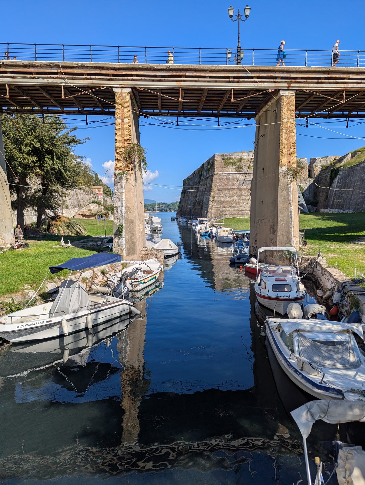Am 7. September feiern wir dann das Wiedersehen mit unseren Freunden von der SY Joyfull in Korfu Stadt. Wir verbringen nochmal einige schöne Tage zusammen, treffen uns abends vor Anker zum Spieleabend und gemeinsamen Essen und tauschen Geschichten aus. Mit dem Dinghi kann man von Korfu Stadt aus wunderbar bis nahezu vor die Tür eines großen Lidl-Supermarktes fahren, was wir natürlich ausgiebig nutzen, um unsere Vorräte aufzufüllen. Auch den kleinen Kanal zwischen der großen Festung und der Altstadt erkunden wir mit dem Dinghi und fühlen uns fast wie in Amsterdam.