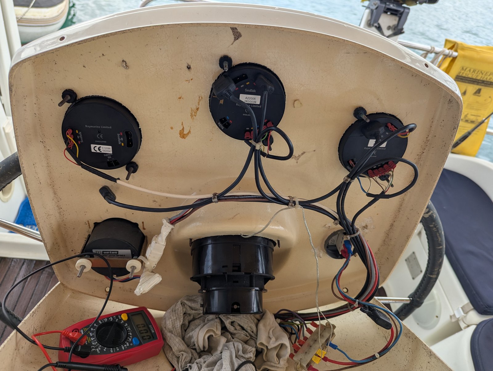 Da die Navigationselektronik zusammen in einem SeaTalk Netzwerk arbeitet, müssen zunächst alle Geräte getrennt und dann jeweils einzeln getestet werden, um so das defekte Teil zu finden. Am Ende entpuppt sich unsere Tridata Anzeige (Tiefenmesser, Geschwindigkeit, Wassertemperatur) als Übeltäter, wir müssen die Verkabelung so umgestalten, dass wir dieses Gerät aus dem Netzwerk entfernen. Auf diese Weise funktioniert nahezu alles wie vorher. Das einzige was wir hierdurch einbüßen ist die Funktionalität aus der scheinbaren Windstärke und dem scheinbaren Windwinkel, die wahre Windstärke und den wahren Windwinkel zu berechnen. Also im Klartext: Wir sehen sowohl Geschwindigkeit, Tiefe und Wassertemperatur weiter auf dem Display, speisen sie jedoch nicht mehr ins Netzwerk ein, was dazu führt, dass andere Instrumente diese Daten nicht mehr zur Verfügung haben, um abhängige Metriken zu berechnen. Das soll uns jedoch nicht weiter stören, ein Ausfall des Autopiloten oder des Tiefenmessers wäre weitaus dramatischer gewesen.