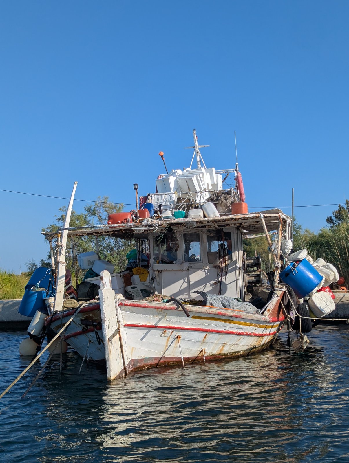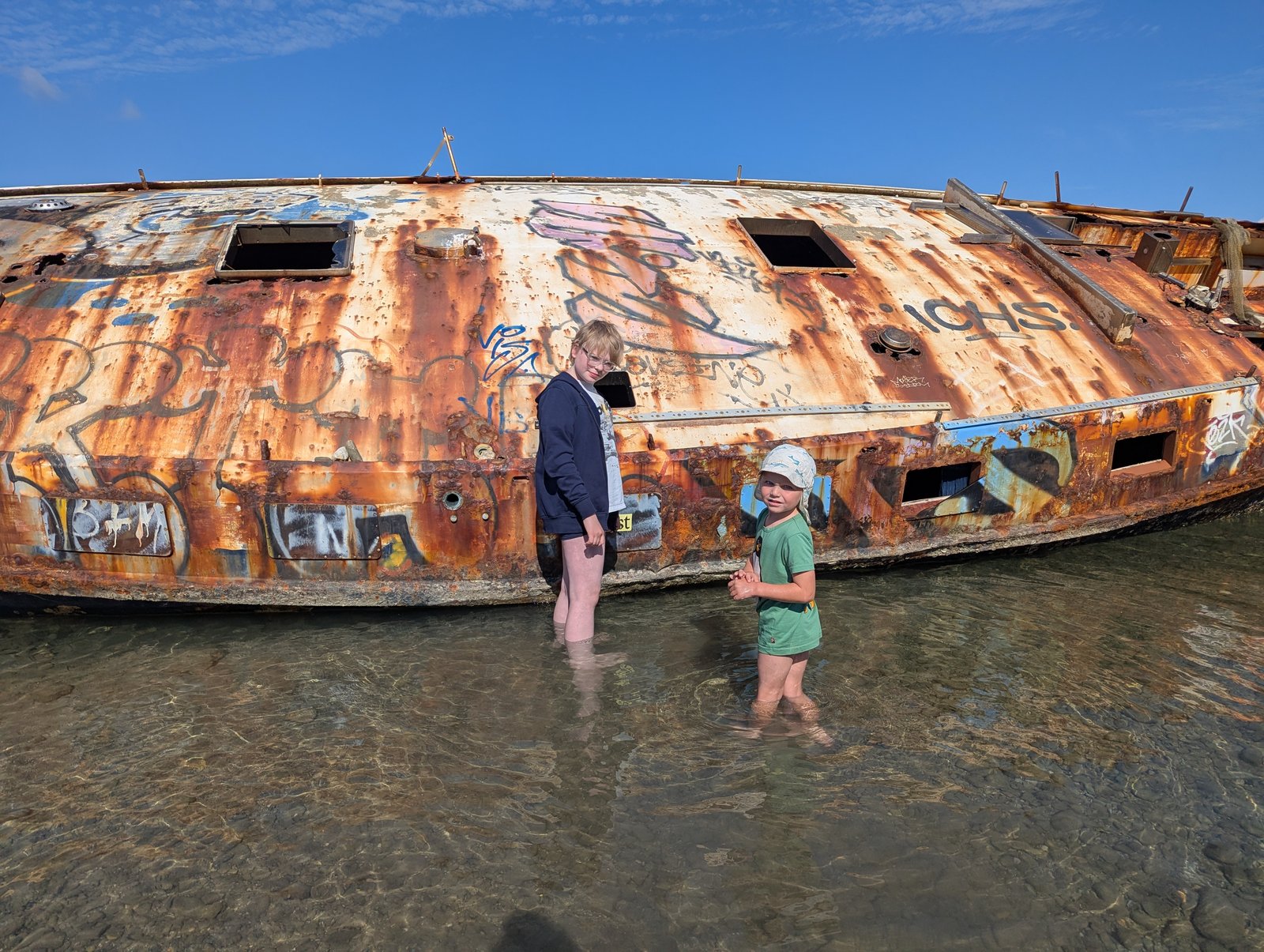 In der Bucht von Petriti liegt ein Schiffswrack in Ufernähe. Man kann problemlos vom Strand aus durchs flache Wasser waten, um es zu erreichen und aus nächster Nähe zu begutachten. Über das Schicksal des Stahl-Segelboots konnten wir leider nichts weiter erfahren.