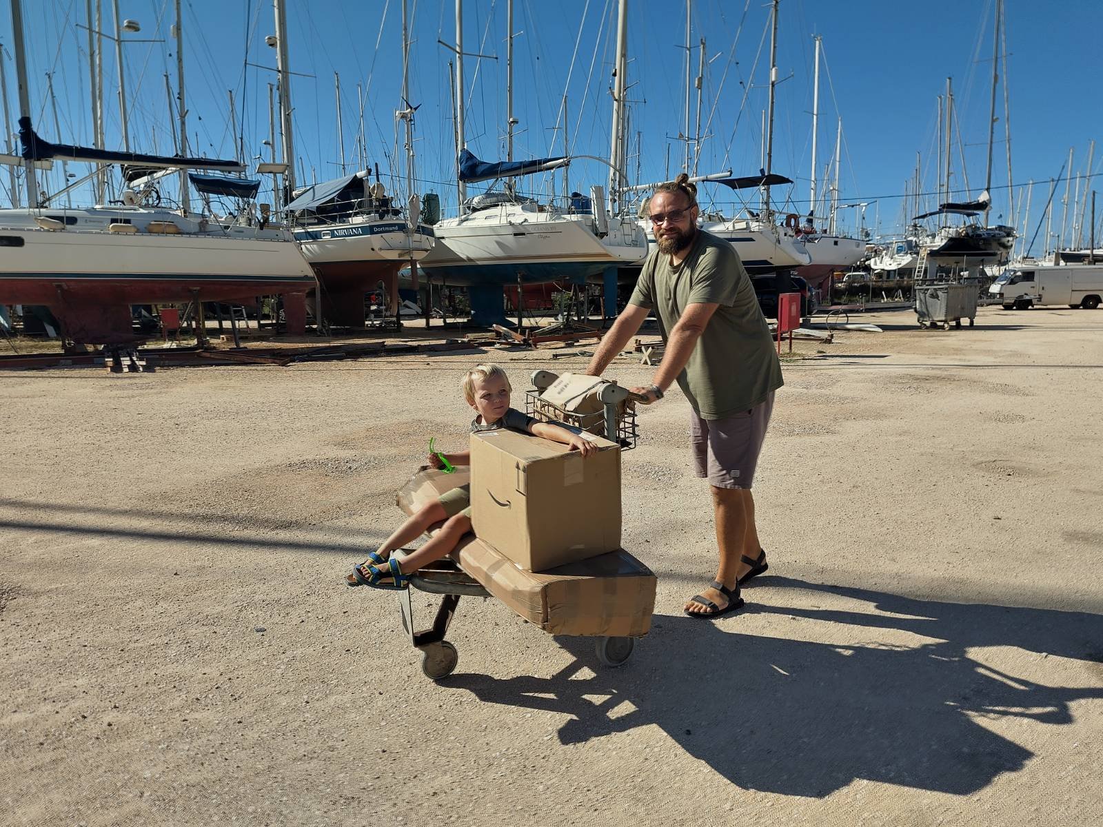 Über Kleinanzeigen hatten wir uns in Berlin einen nahezu nagelneuen Elektro-Außenborder, den ePropulsion Spirit 1.0 Plus, gekauft und per DHL nach Preveza schicken lassen. Mit Spannung holen wir das 30 kg schwere Paket aus dem Büro ab, in dem sich sowohl der Außenborder als auch noch ein paar andere Dinge befinden, die wir uns auf diesem Weg aus Deutschland haben zukommen lassen.