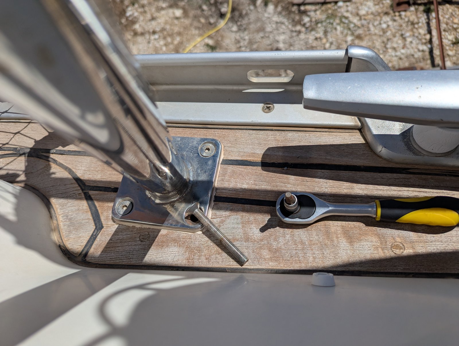 Eine weitere Kleinigkeit trübt die Freude über die Rückkehr zum Boot: Es ist etwas Regenwasser ins Schiff gekommen. Als wir das Boot mit dem Gartenschlauch abspülen, ist der Übeltäter schnell gefunden: Das Wasser rinnt über die Schraubverbindung des Geräteträgers am Heck in die Achterkabine. Offenbar haben die Kollegen in Italien beim Anbau des Geräteträgers vergessen die Schrauben mit Dichtmasse zu versehen. Entsprechend holen wir das jetzt nach und dichten die Schrauben mit Sikaflex ab. Da wir den Geräteträger nicht mal eben so abnehmen können, dürfen wir stattdessen immer nur jeweils eine Schraube lösen, Dichtmasse in das Loch einbringen (wobei wir nicht geizen!) um anschließend die Schraube wieder in das Loch zu führen und durch die Kontermutter im Inneren des Bootes zu sichern. Was sich hier beim Schreiben des Textes so einfach anhört, ist in der Praxis eine schweißtreibende Angelegenheit, die Elvira nahezu an ihre körperlichen Grenzen bringt, denn sie muss sich dabei in alle möglichen Verrenkungen begeben, um an die Schrauben zu gelangen und dabei irgendwie noch genug Kraft aufbringen, damit die Schrauben am Ende auch wieder fest sitzen. Am Ende gelingt aber auch dieses Projekt und wir sind froh, dass wir diese Undichtigkeit gefunden und behoben haben, bevor das Boot in wenigen Monaten alleine dem griechischen Winter ausgesetzt ist.