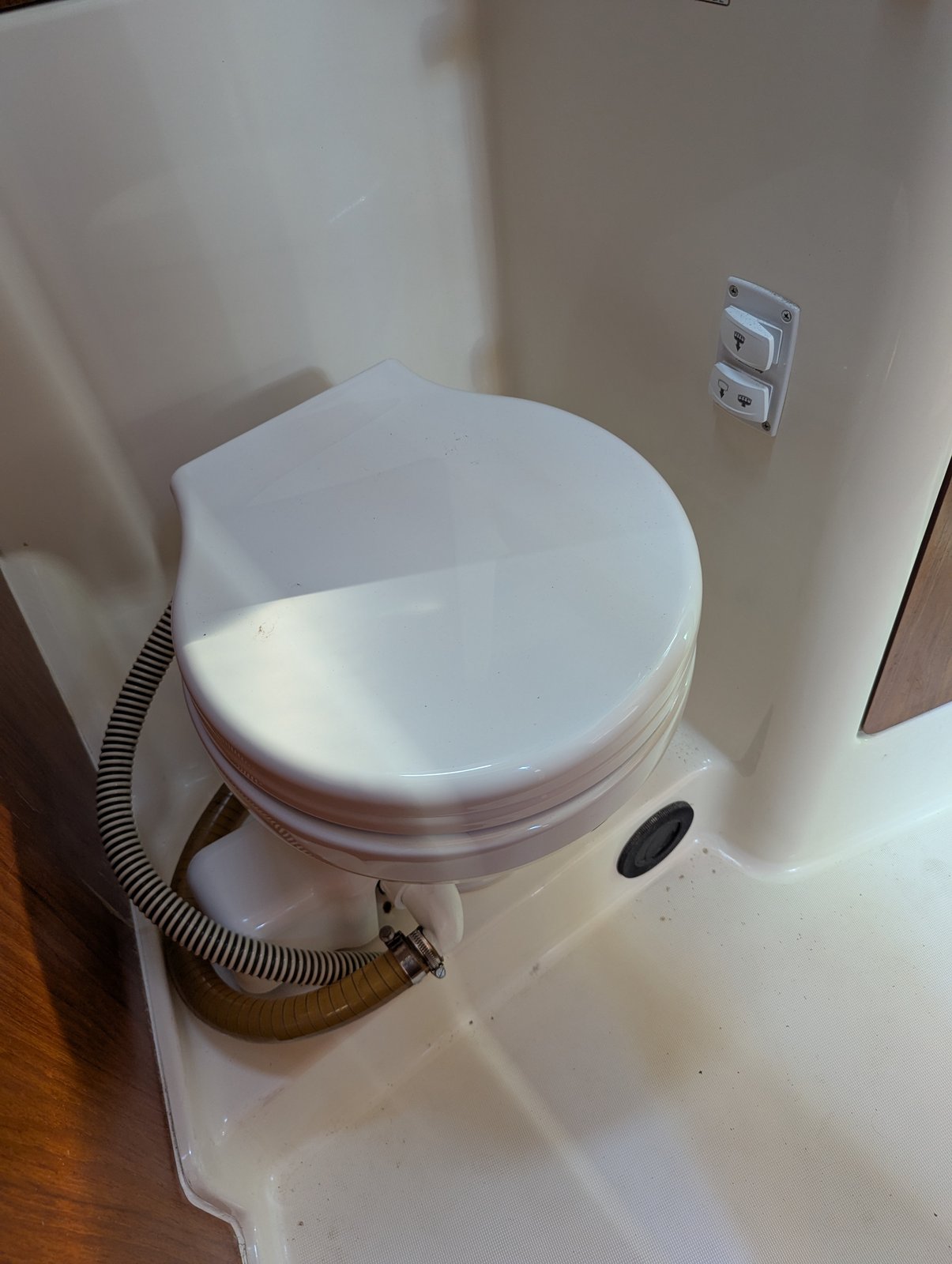 Doch wir haben in den wenigen Tagen, bevor unsere Wanderer zurück ins Wasser kommen soll, noch weitere Arbeiten geplant. Allen voran steht die neue Toilette, die wir bereits vor Wochen beim Ship Chandler in der Cleopatra Marina geordert haben. Unsere elektrische Toilette macht hin und wieder Probleme und wir stehen vor der Wahl, ob wir sie warten oder komplett ersetzen sollen. Wir entscheiden uns schließlich für eine neue Johnson Silent Flush, bei der man das Ansaugen von Spülwasser und das Absaugen des Schmutzwassers separat steuern kann. Es gibt also drei Knöpfe: Einen der Ansaugen und Absaugen kombiniert (Normalfall) und einen Kipptaster, der in eine Richtung nur ansaugt und in die andere Richtung nur absaugt. Beim Einbau gibt es dann eine kleine Überraschung, denn keiner von uns hatte bedacht, dass diese erweiterte Funktionalität funktionsbedingt auch eine zweite Pumpe erfordert, die noch irgendwo im engen Unterschrank verbaut werden muss. Erschwerend kommt hinzu, dass sich Christoph in Deutschland sein Knie verletzt hat und nahezu alle Arbeiten, die eine gewisse körperliche Flexibilität erfordern, von Elvira erledigt werden müssen.