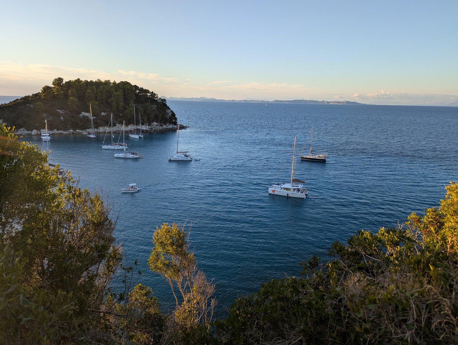Über die dritte Überraschung freuen wir uns am meisten, denn völlig ohne Vorankündigung sehen wir plötzlich die Godewind von Michel und Elvira (!) in die Bucht einlaufen. Wir hatten die beiden im Frühjahr auf Sizilien kennengelernt und uns auf Anhieb gut verstanden. Wir rufen und winken und sitzen wenige Minuten später bereits beim Campari in ihrem Cockpit und tauschen Geschichten aus.