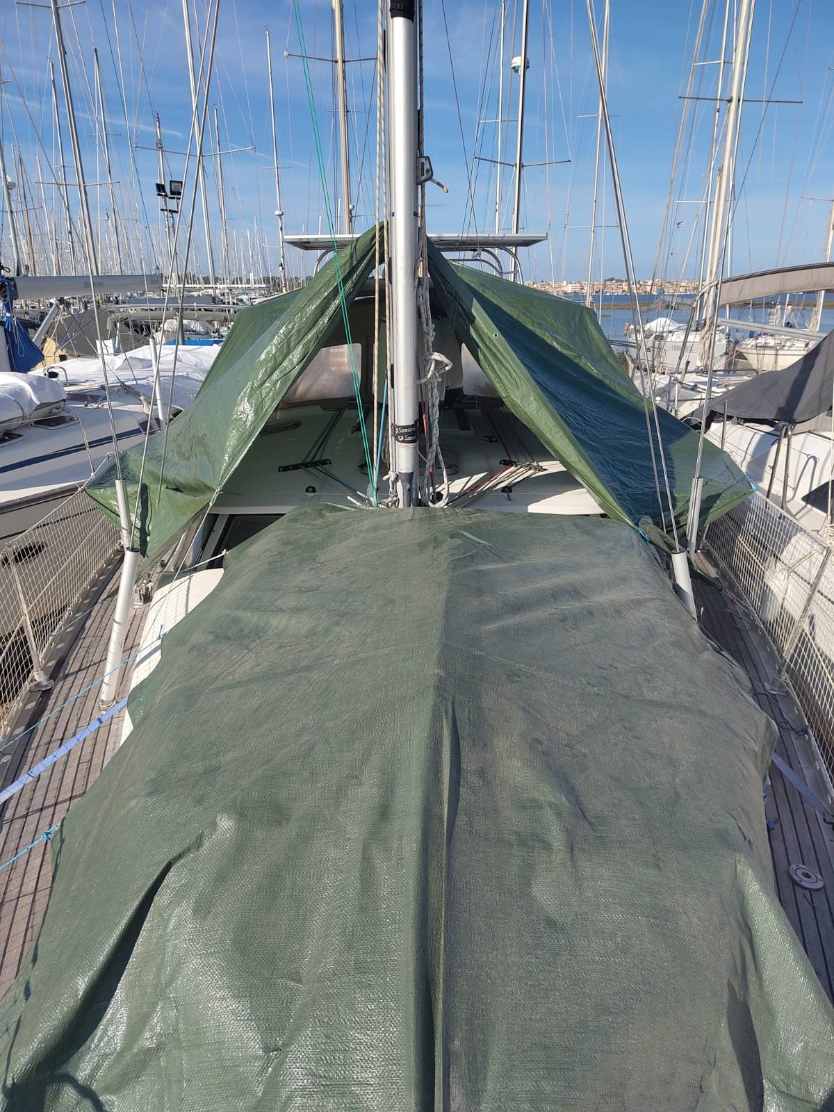 Auf diese Weise können wir bereits am Samstag und Sonntag das Abschlagen, Falten und Verstauen der sperrigen neuen Segel vornehmen, was vor Anker oder auf dem Trockendock längst nicht so bequem funktioniert hätte wie in der Slipanlage. Am Montag holt uns der Kran schließlich aus dem Wasser und dieses Mal vergessen wir auch nicht, den Kranführer nach dem Gewicht zu fragen. 14 Tonnen bringt unsere Jeanneau 43 DS auf die Waage, wir lieben jedes Gramm an ihr! Nachdem die schweren Maschinen unser Dickschiff an ihren Winterschlafplatz bringen, beginnt das Einwintern. Wir haben uns ein (hoffentlich) ausgefeiltes System an verschiedensten passiven Entfeuchtern + Schalen mit Katzenstreu einfallen lassen, um der Winterfeuchte hoffentlich genug entgegenzusetzen, dass uns im Frühjahr keine Schimmelkatastrophe erwartet. Zudem verpacken wir das ganze Boot in reichlich Plane, um die sensibelsten Stellen vor andauerndem Regen zu schützen.