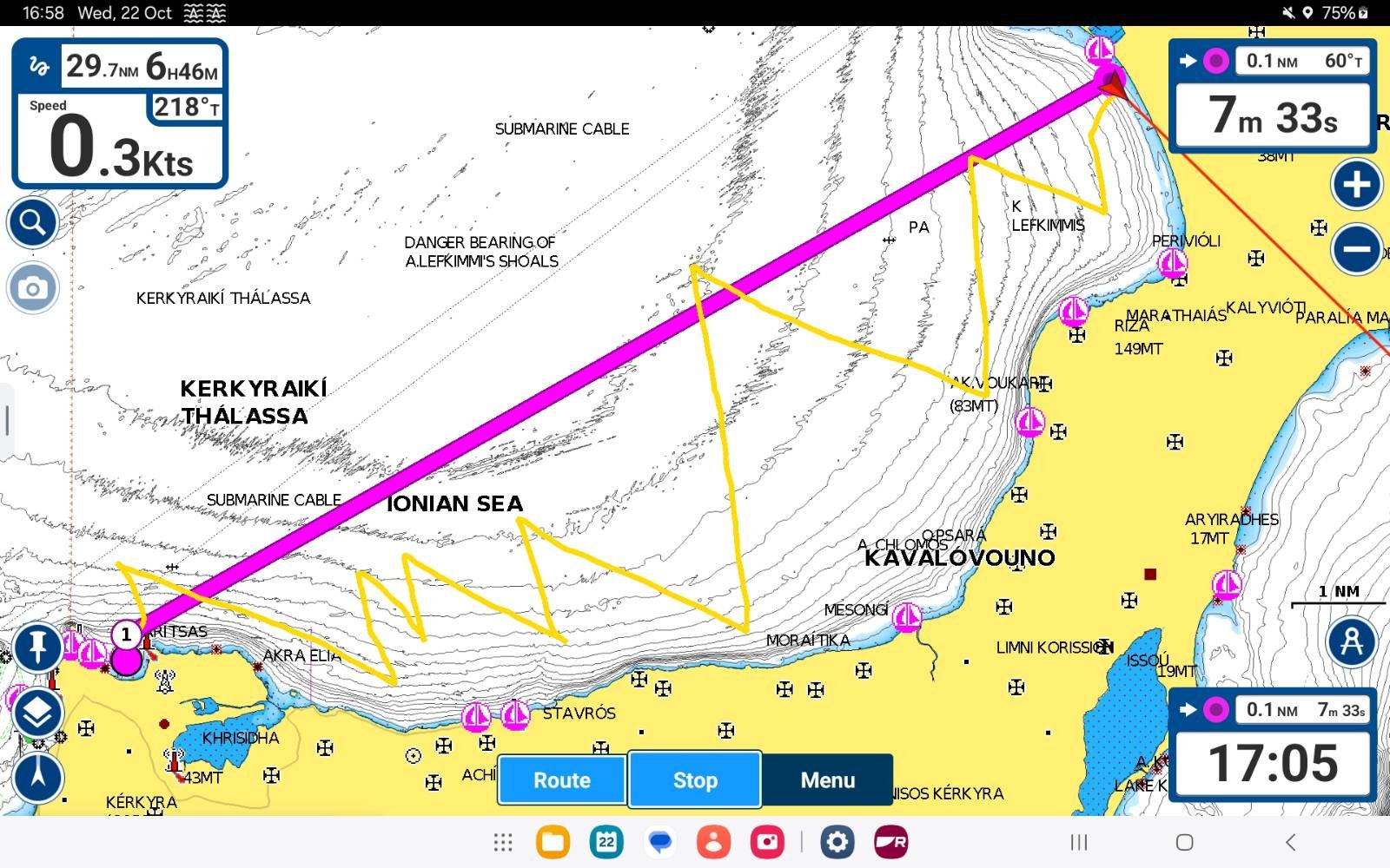 Und so geht unsere Zeit zu fünft auch bereits rasch wieder ihrem Ende zu. Von Sivota segeln wir über Mesongi zurück nach Korfu Stadt, wo Lahjan und Annette am 22. Oktober wieder ihren Flug nach Deutschland antreten werden. Leider spielt das Wetter nicht mit und Starkwind bläst direkt in die Bucht, die ohnehin bereits keinen besonders guten Ankergrund bietet. Normalerweise würden wir bei diesen Bedingungen nicht in dieser Bucht ankern wollen, doch der Flugplan lässt uns kaum eine andere Wahl. Und so wird bereits die Nacht vom 21. auf den 22. noch zu einer authentischen Demonstration, was es bedeutet auf dem Wasser Zuhause zu sein. Mehrmals in der Nacht werden Christoph und Elvira vom Ankeralarm aus dem Schlaf gerissen. Draußen tobt der Wind und die Wellen schlagen hoch. Der Anker rutscht immer mal wieder und wir wissen, dass der Untergrund ein Seegrasfeld mit nur wenig lichten Sandflecken ist, die in der Dunkelheit ohnehin nicht auszumachen sind.
