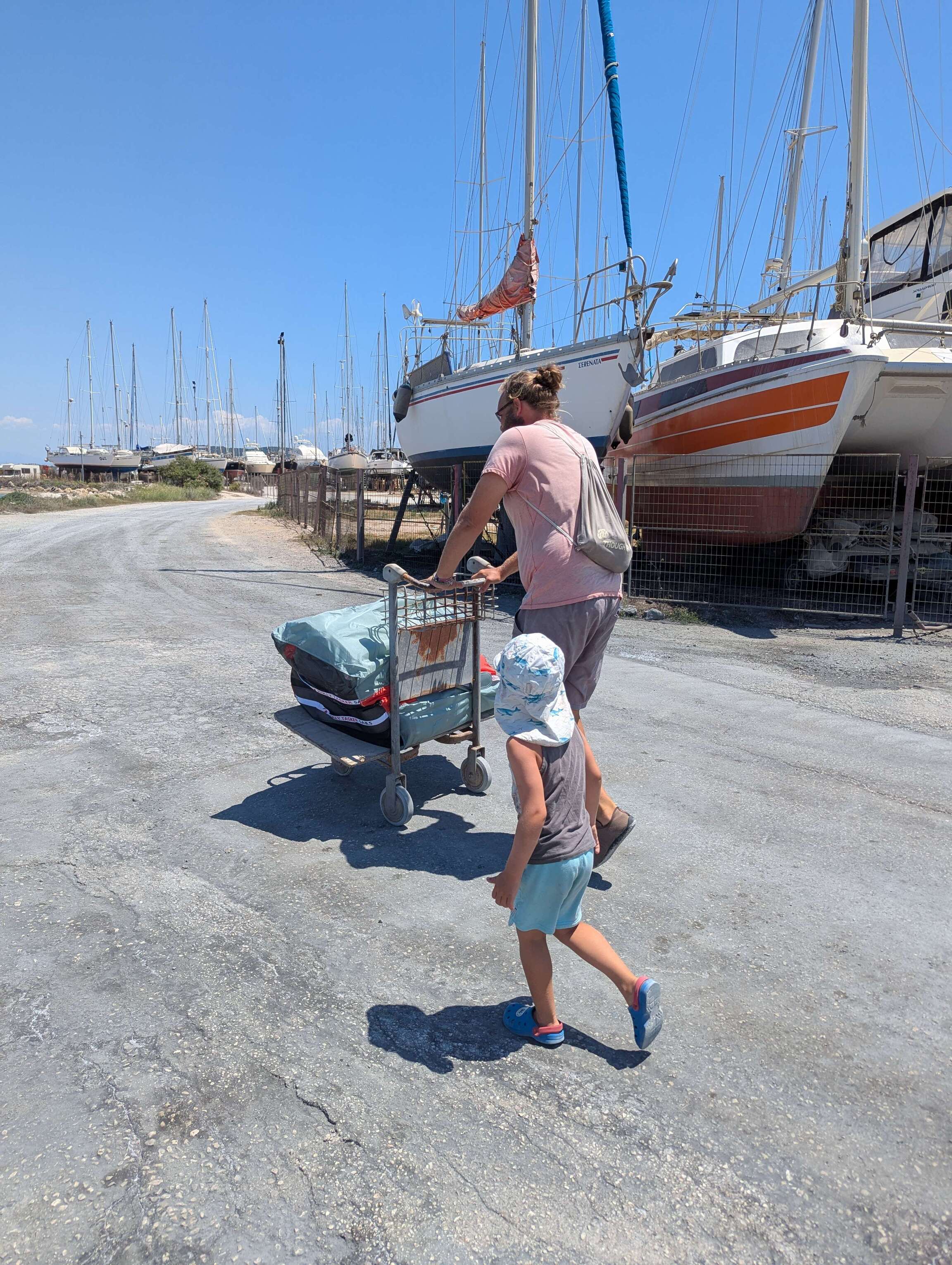 Nachdem wir die Brücke passiert haben fahren wir in eins durch bis zum Ankerplatz vor dem Aktio Trockendock in Preveza. Es ist zwar Sonntag, doch wir wollen mit dem Dinghy anlanden und sehen, ob sich jemand findet, der uns unsere neuen Segel aushändigen kann. Wir haben Glück, das Büro hat zwar geschlossen, doch wie uns ein anwesender Arbeiter erklärt, lagern alle Palettenlieferungen frei zugänglich in einem Bereich neben dem Büro. Einen Nachweis, dass die Palette mit dem riesigen Karton uns gehört, benötigt er nicht. Griechischer Pragmatismus. Und so schnappen wir uns einen Zugwagen und schleifen die kostbare Fracht zu unserem Dinghy und wuchten sie wenige Minuten später angestrengt aber glücklich auf unsere Wanderer.