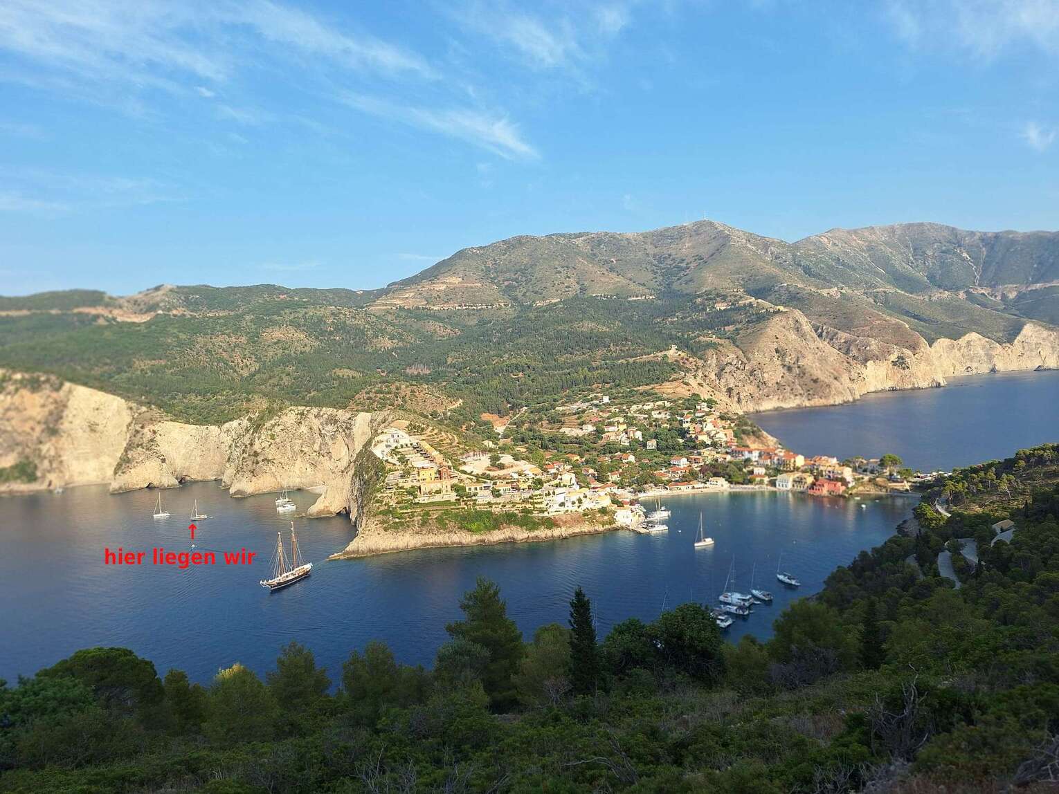 Am Nachmittag bringen wir ofenfrisches Sauerteig Focaccia zu unseren Freunden, die mit Landleinen tiefer in der Bucht vor Anker liegen. Man darf dabei nicht an das trockene Foccacia denken, das man in Deutschland bei der Pizzeria um die Ecke vorgesetzt bekommt. Unser Foccaccia, erinnert eher an Pizza Bianca, wie man sie im Raum Rom auf großen Blechen beim Bäcker bekommt. Mit reichlich Olivenöl, grobem Meersalz und Rosmarin - auch Silvan und Manuela sind begeistert. Asos bleibt dann die nördlichste Station für uns auf Kefalonia.