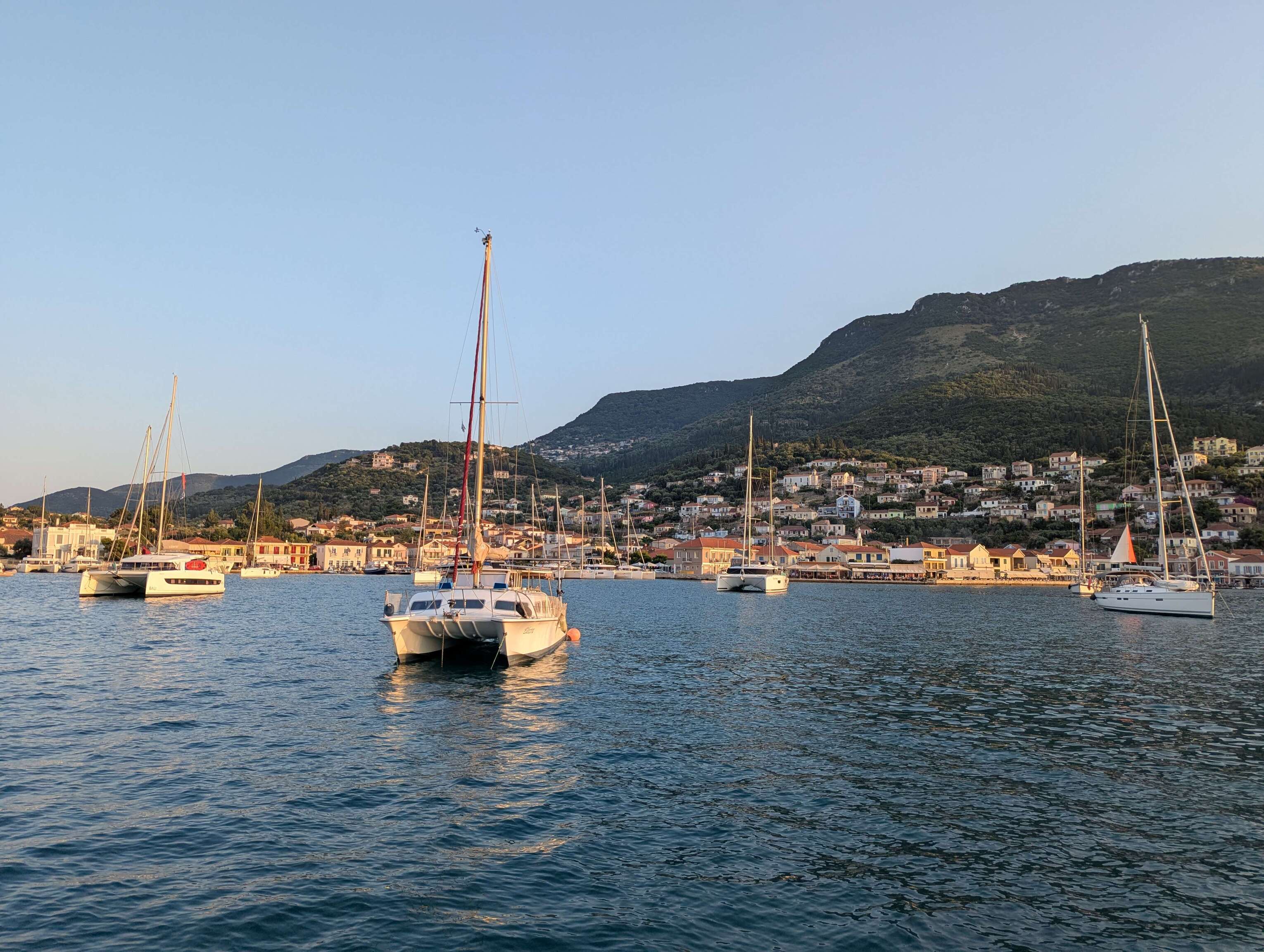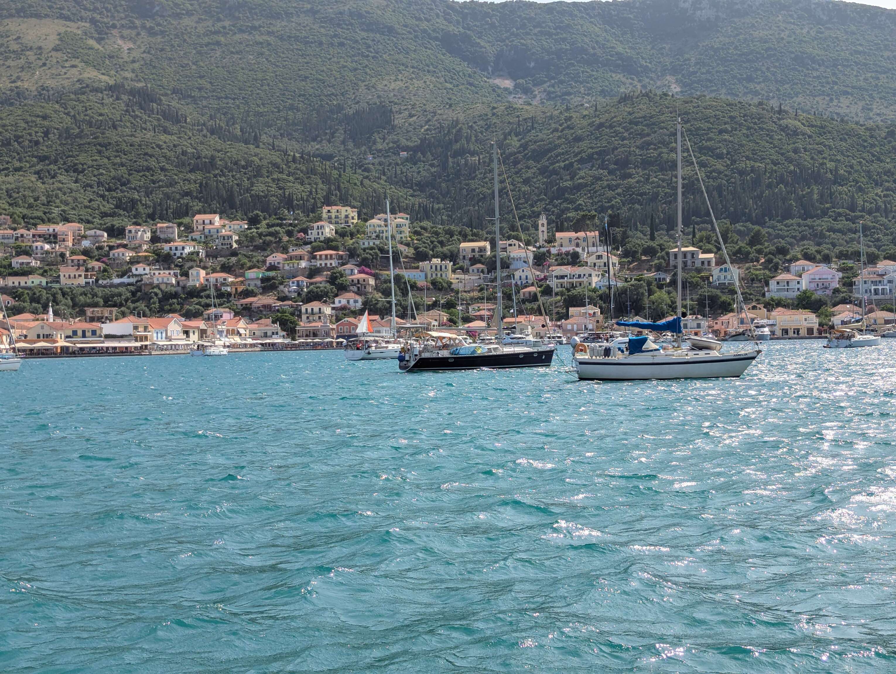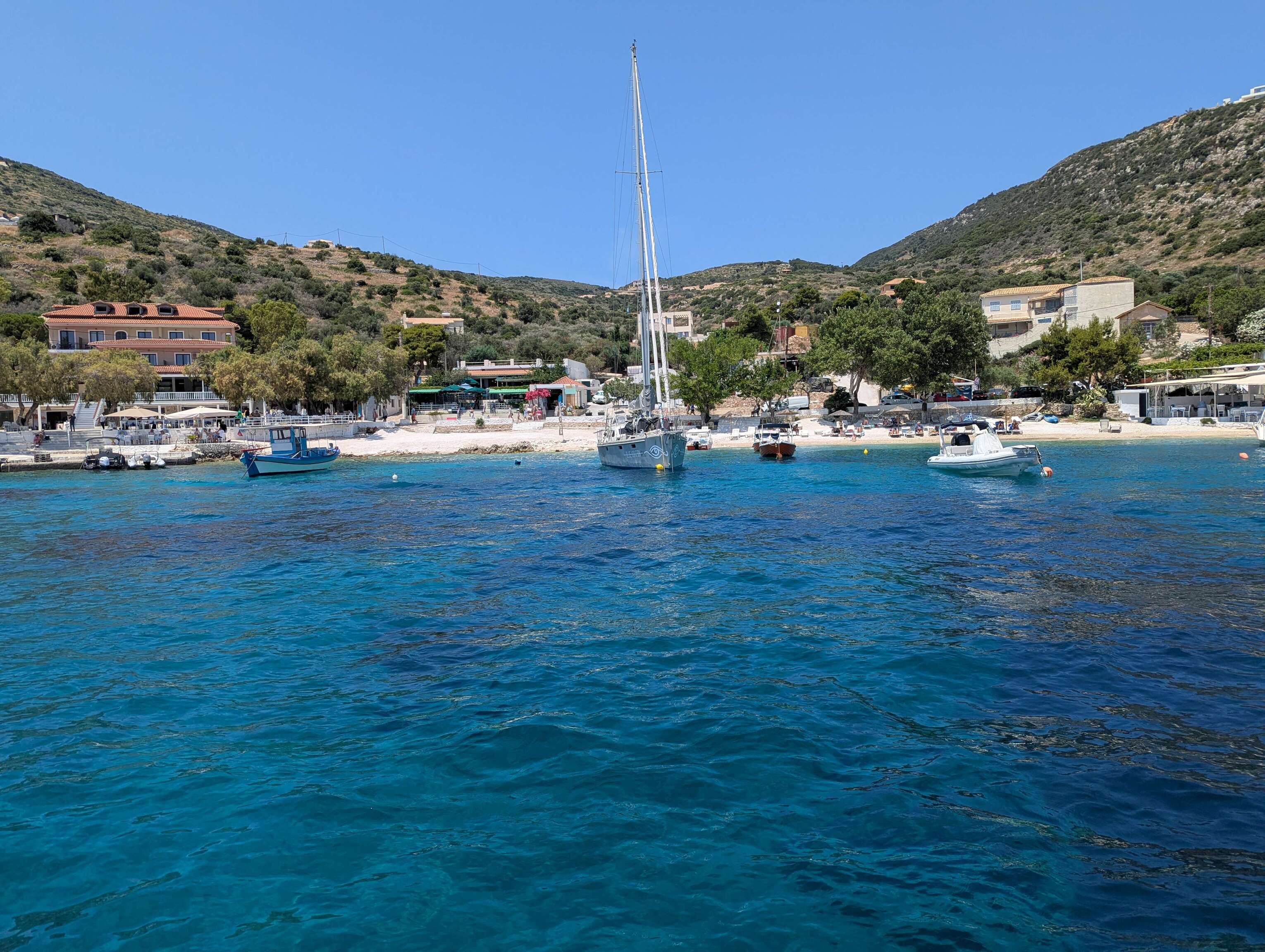 Wir ankern noch eine Nacht am Filiatro Beach bevor wir Ithaka verlassen und weiter nach Kefalonia segeln, der Insel auf der wir vor wenigen Wochen nach unserer Überfahrt von Sizilien angekommen sind. In der Bucht von Agia Effimia haben wir das größte Angelglück der Saison. Silvan und Christoph ziehen einige Bläuel und Brandbrassen aus dem Wasser und wir veranstalten ein großes gemeinsames Fischessen. Überhaupt gefällt uns der Ort sehr. Wir werden Stammgast im örtlichen Angelladen und Eric schließt bereits Freundschaften auf dem Spielplatz, den wir täglich besuchen.
