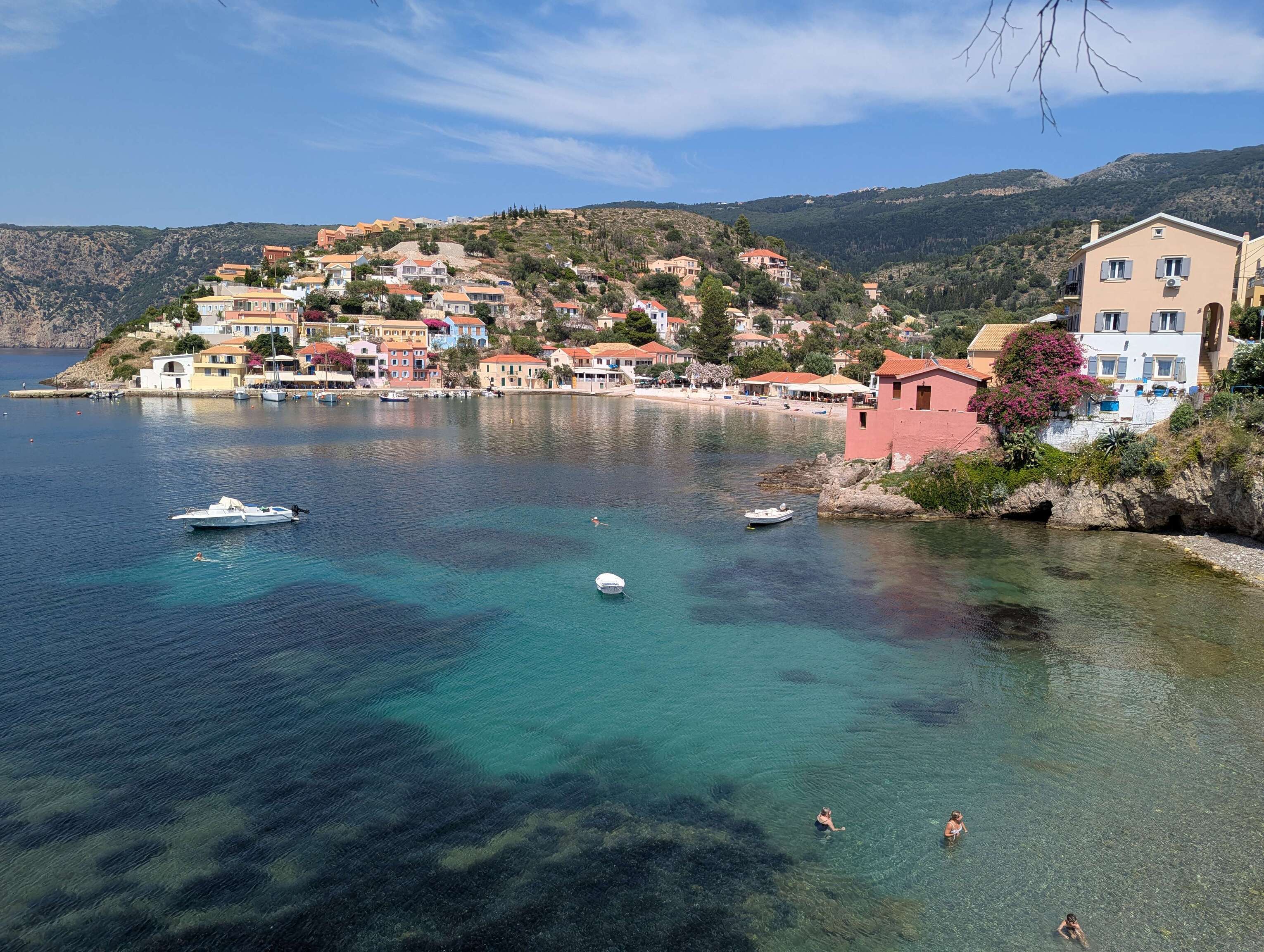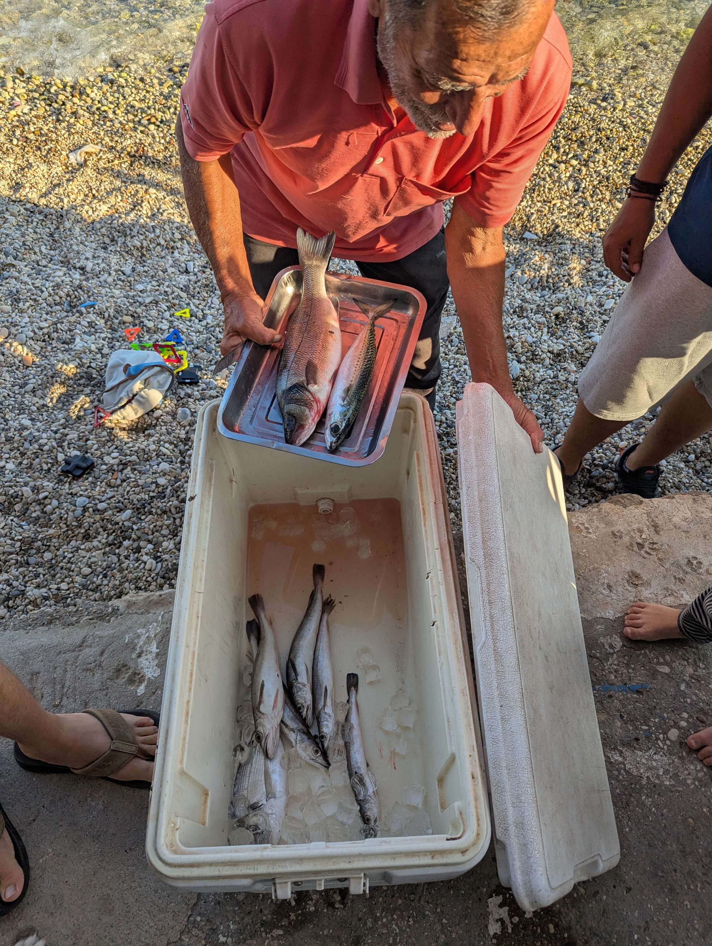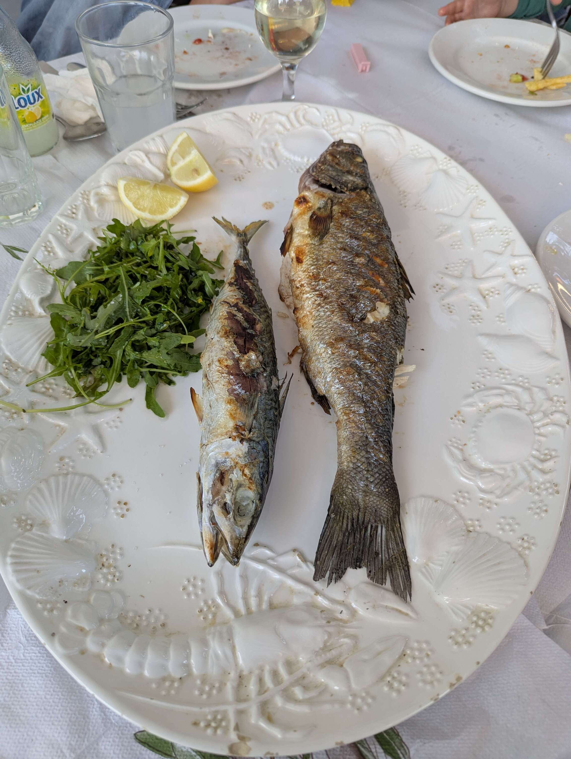 Wir ankern noch eine Nacht am Filiatro Beach bevor wir Ithaka verlassen und weiter nach Kefalonia segeln, der Insel auf der wir vor wenigen Wochen nach unserer Überfahrt von Sizilien angekommen sind. In der Bucht von Agia Effimia haben wir das größte Angelglück der Saison. Silvan und Christoph ziehen einige Bläuel und Brandbrassen aus dem Wasser und wir veranstalten ein großes gemeinsames Fischessen. Überhaupt gefällt uns der Ort sehr. Wir werden Stammgast im örtlichen Angelladen und Eric schließt bereits Freundschaften auf dem Spielplatz, den wir täglich besuchen.