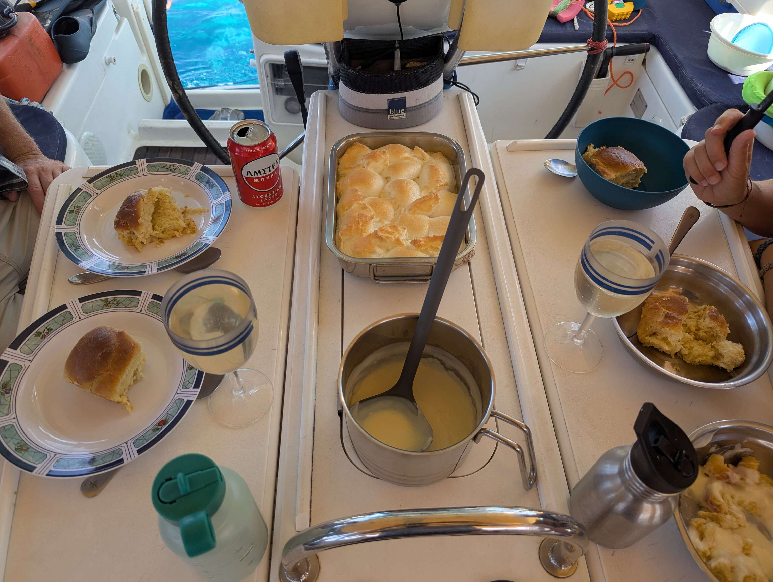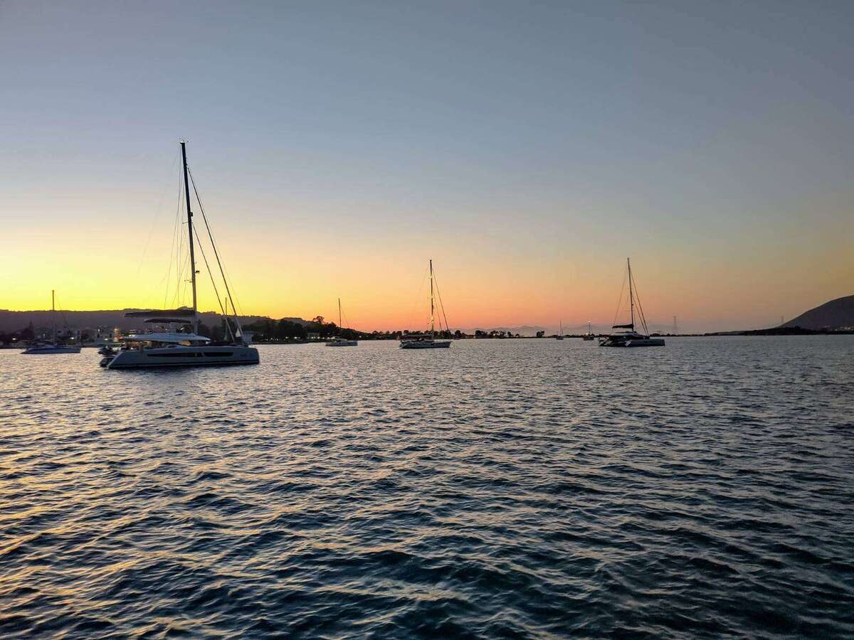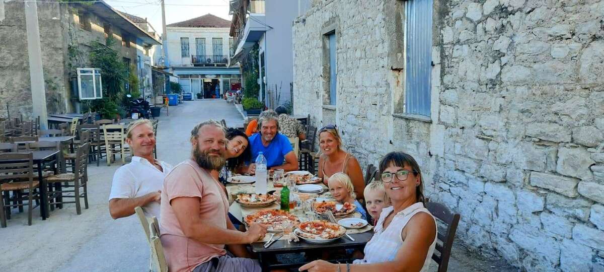 Von jetzt an sind wir wieder mit Buddy Boat unterwegs. Das Wetter gibt ein bisschen den Takt vor und wir beschließen gemeinsam nach Mitikas zu segeln, um dort den kommenden Starkwind abzuwettern. Zusammen frühstücken wir Bougatsa, ein griechisches Blätterteiggebäck mit fluffiger Puddingcremefüllung, dass wir bereits bei unserem vorherigen Besuch in Mitikas kennen und lieben gelernt haben. Abends kommen noch Freunde der Alegra mit ihrem Katamaran Starlight III in die Bucht und wir gehen alle zusammen Pizza essen. Heribert kommt aus Deutschland doch lebt mit seiner maltesischen Frau Romina bereits seit einigen Jahren auf dem Katamaran. Die beiden werden hellhörig als wir von Portugal erzählen, denn auch sie treibt der Gedanke um irgendwo ein zweites Zuhause an Land aufzubauen. Ein Thema das viele Langfahrer immer wieder beschäftigt. Auch wir mögen die Abwechslung und tanken in der Regel in den Monaten November bis April neue Energie an unserer Wahlheimat Tavira an der Algarve. Es ist ein lustiger Abend, wir schießen gemeinsame Erinnerungsfotos, tauschen unsere AIS Nummern aus und hoffen, dass sich die Wege irgendwo wieder kreuzen werden.