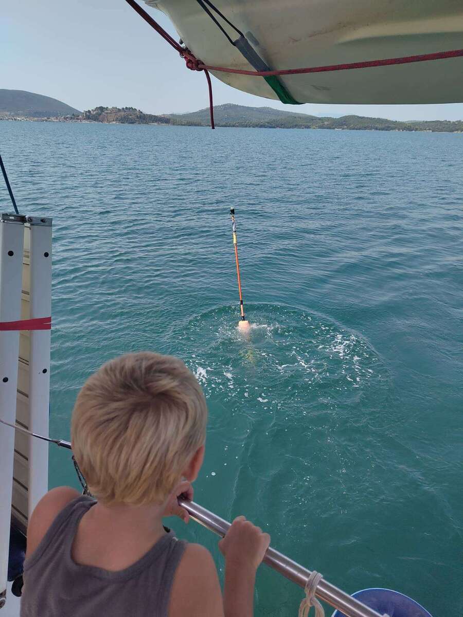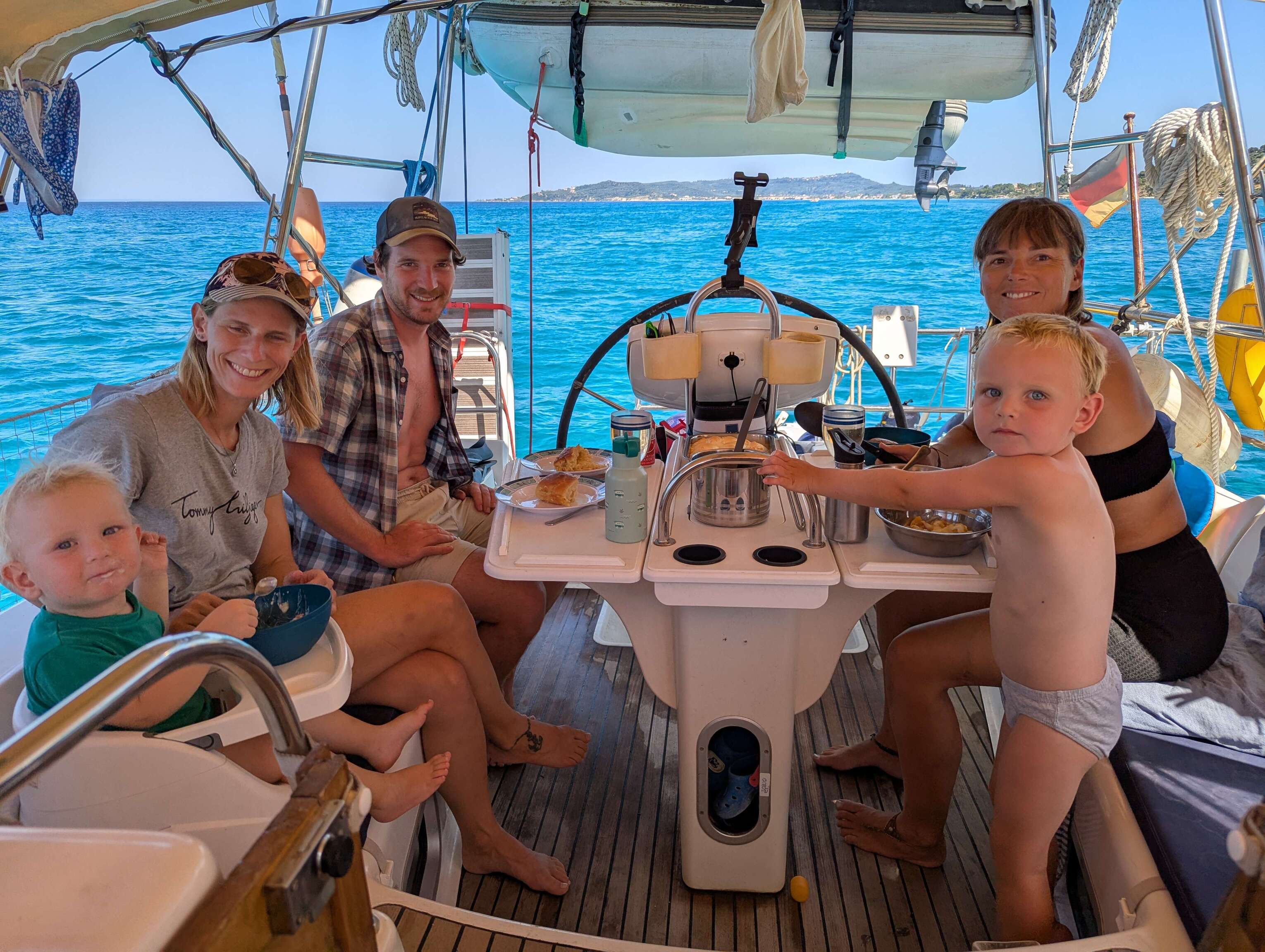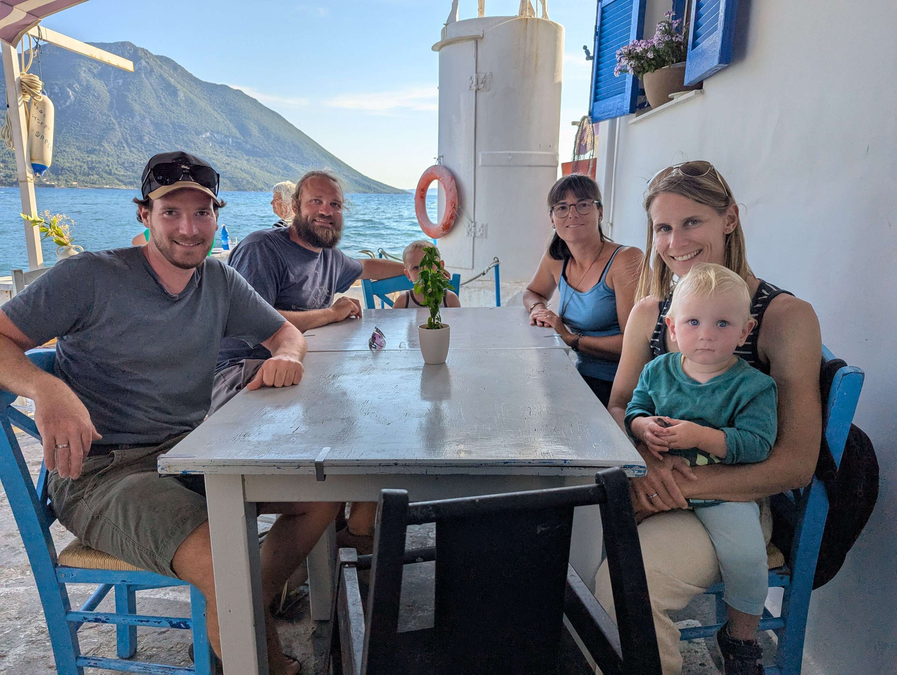 Nach der langen Etappe am Vortag lassen wir es nun wieder ruhiger angehen und verlegen uns nur wenige Meilen weiter in die Bucht Ormos Oxias. Nicht nur, dass uns hier eine Dorade an den Haken geht, sondern es ereilt uns auch noch eine spannende Nachricht über die Cruiser App "noforeignland". Die Segelyacht Alegra ist in der Nähe und man sagt uns, dass die dreijährige Marlene unbedingt unseren Eric kennenlernen möchte. Wir verabreden ein Treffen in Astakos und die Chemie stimmt auf Anhieb. Sebastian, Anja und Marlene sind mit ihrer Dufour 45 Classic bereits seit sechs Jahren unterwegs, haben wie wir Deutschland schon vor vielen Jahren den Rücken gekehrt und besitzen ein Haus in Italien, das sie als Basis nutzen. Sie sind Abenteurer durch und durch, haben bereits auf Fahrrädern den Oman durchquert und sind mit Kajaks um Sardinien gepaddelt. Während die Kids miteinander spielen, tauschen wir Geschichten aus und trinken Eiskaffee.