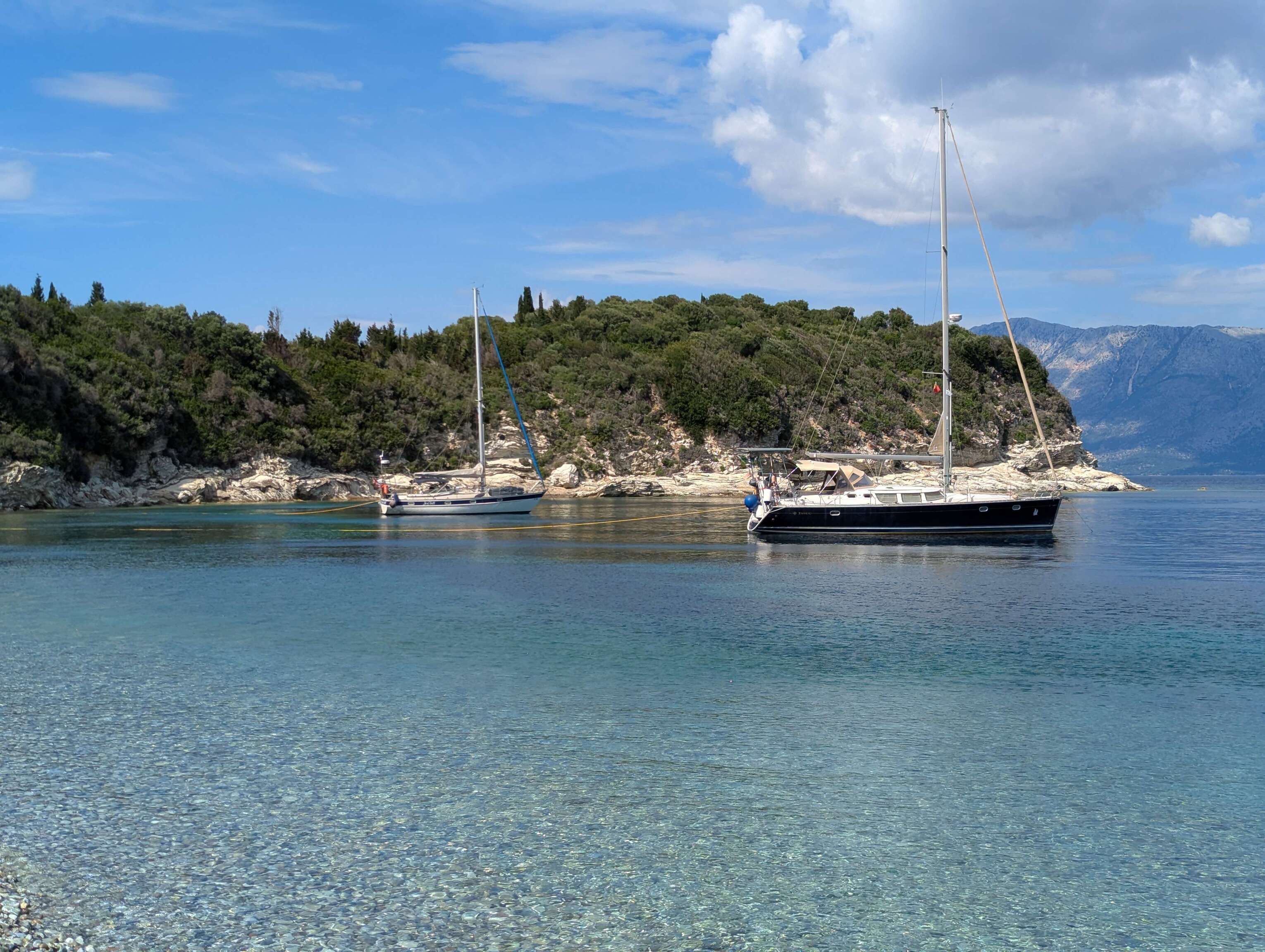 Als unser erster Sturm der Saison vorübergezogen ist freuen wir uns darauf die Bucht von Nidri endlich zu verlassen. Nicht, dass es uns nicht gefallen hätte, ganz im Gegenteil, aber wir sehnen uns nach kristallklarem Wasser und möchten endlich die Badesaison eröffnen. Gemeinsam mit der Joyfull segeln wir nur wenige Meilen zur Nachbarinseln Meganisi, wo wir zum ersten Mal überhaupt mit Landleinen ankern. Unsere Freunde haben das Manöver bereits mehrfach durchgeführt und so kommt es uns sehr gelegen, dass Silvan uns dabei hilft die Landleinen mit dem Dinghi zu ein paar großen Felsen auszubringen, während Christoph die Wanderer mit dem Heck zum Land hält.
