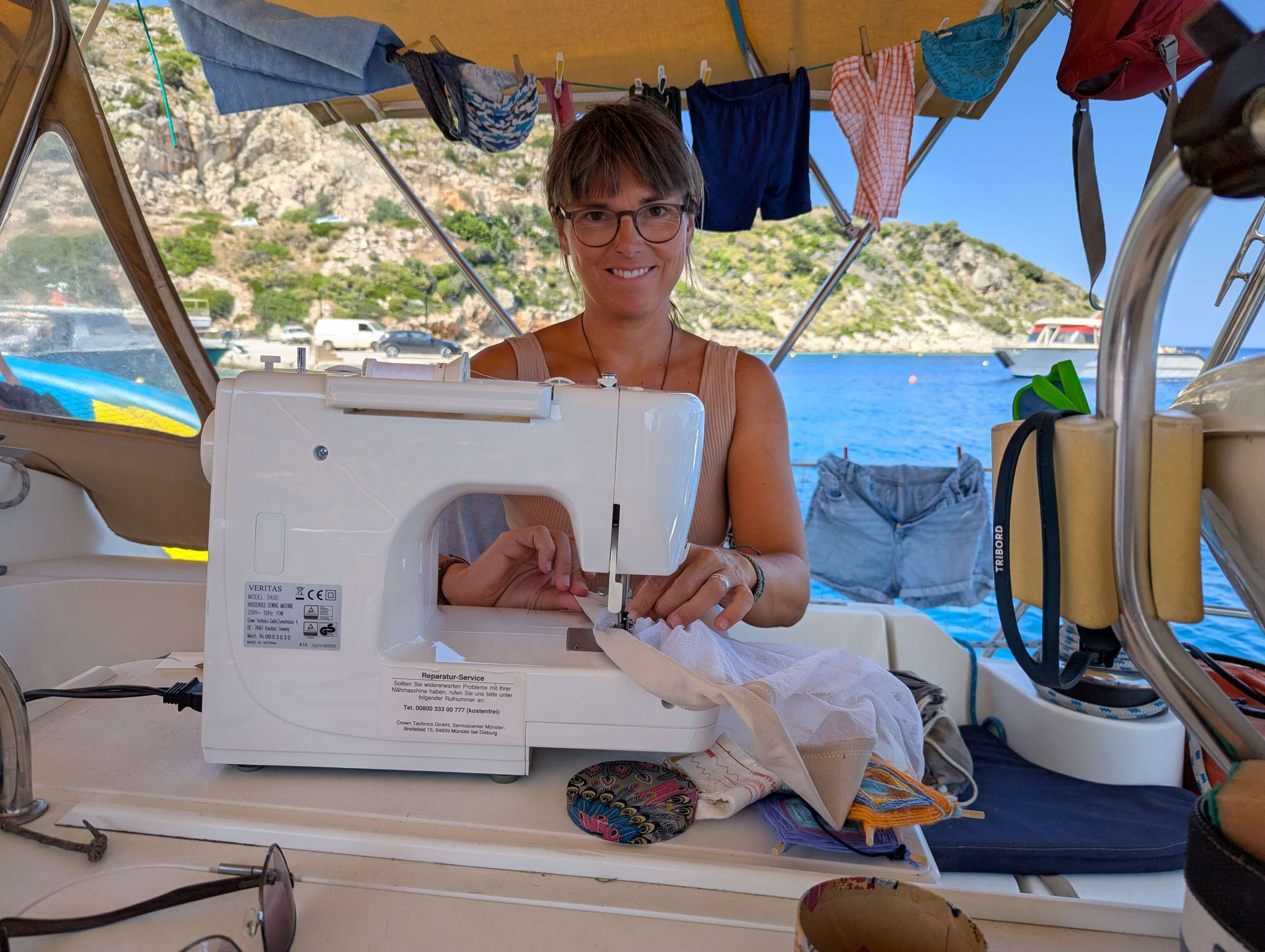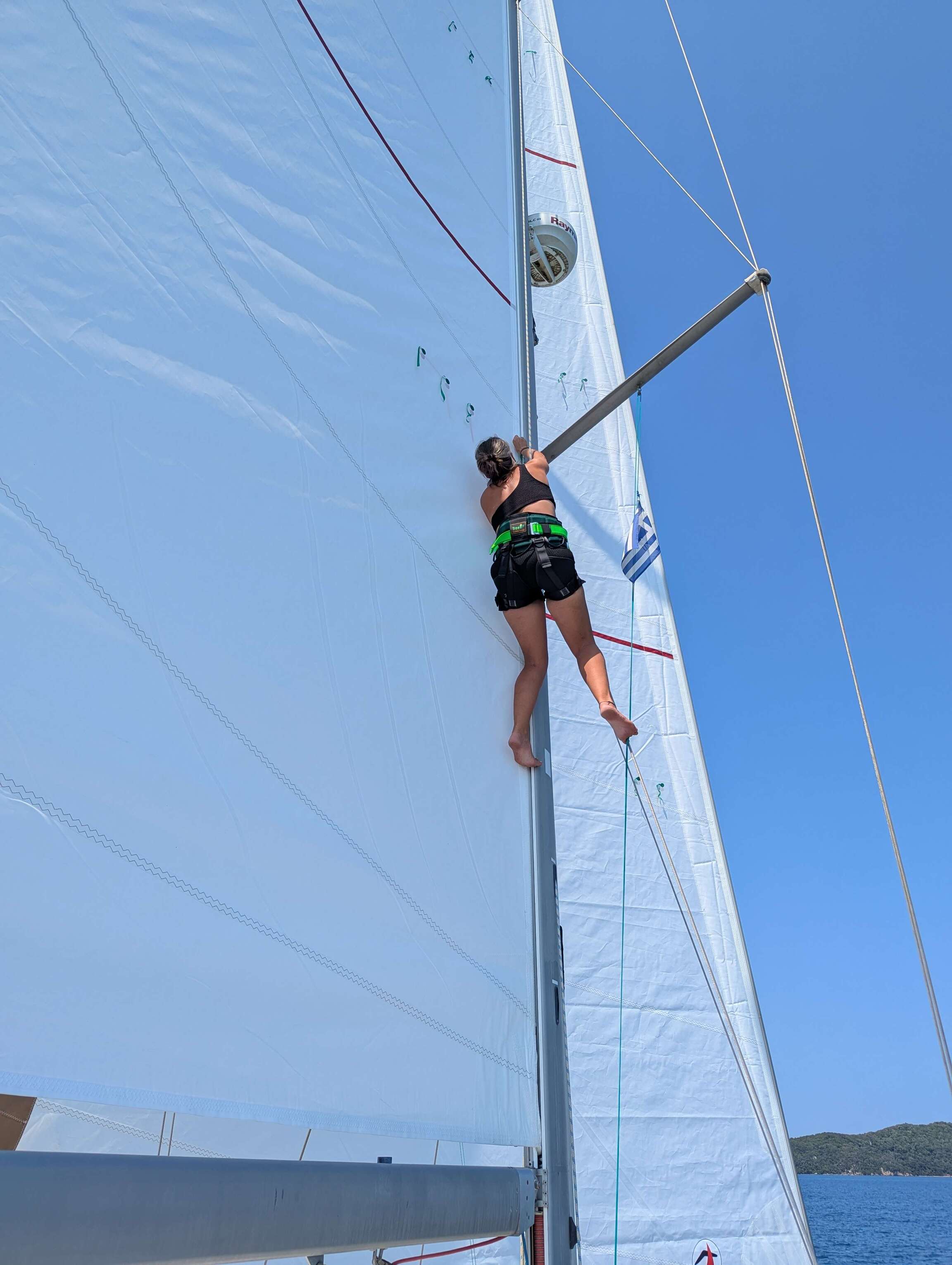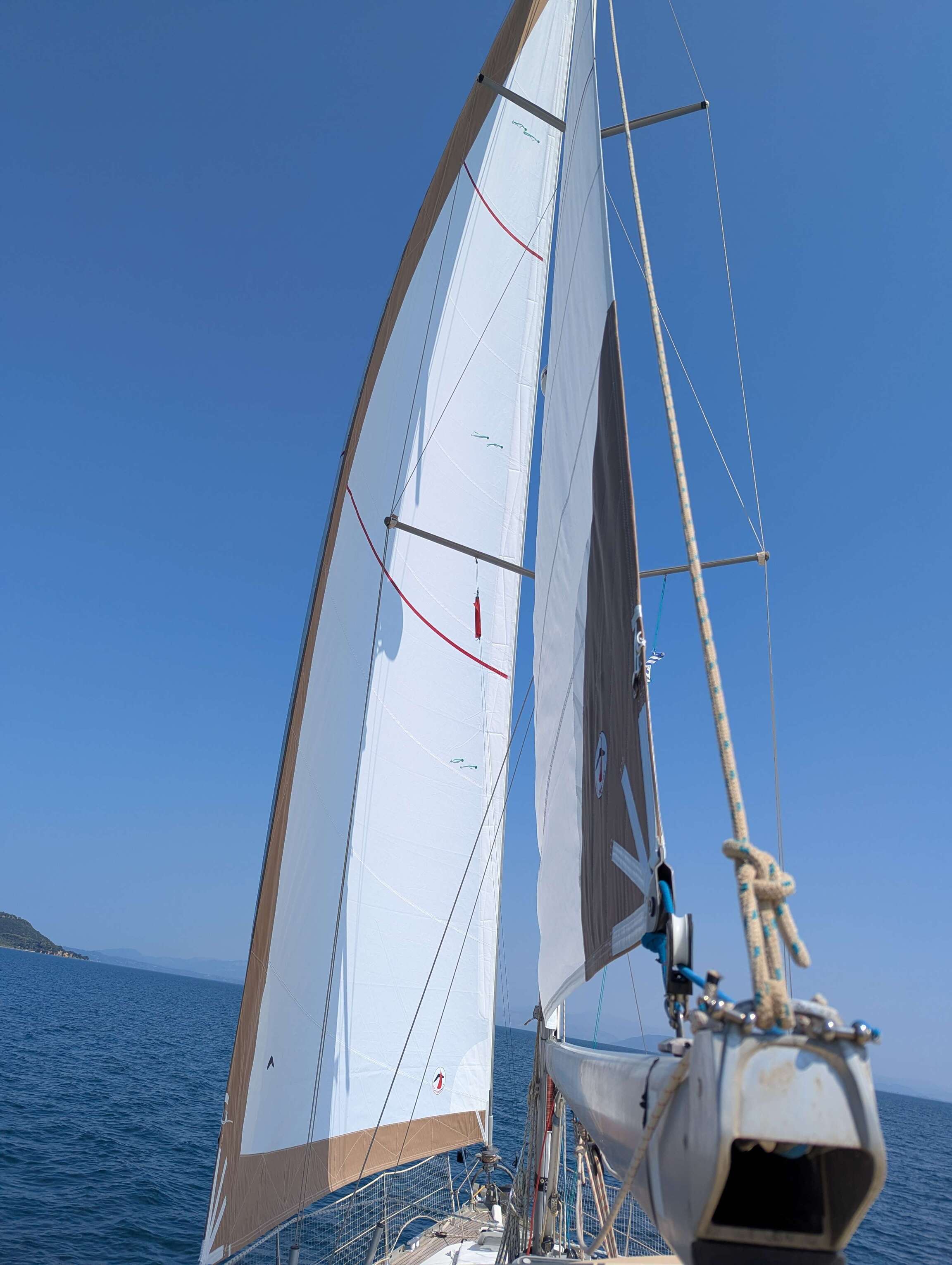 Am nächsten Morgen starten wir früh morgens bevor der Wind auffrischt um die alten Segel ab- und die neuen Segel anzuschlagen. Eine schweißtreibende Angelegenheit, die uns bis zum Vormittag beschäftigt. Bei der Genua gibt es leider eine kleine Überraschung: Der UV-Schutz wurde auf der anderen Seite des Segels angebracht, sodass wir die Reffleine nun entsprechend andersherum um die Trommel wickeln müssen. Im ungünstigsten Fall, könnte das bedeuten, dass wir die gesamte Leinenführung an Deck ändern müssten. Wir haben jedoch Glück und können mit minimalen Anpassungen die Leinenführung beibehalten.
