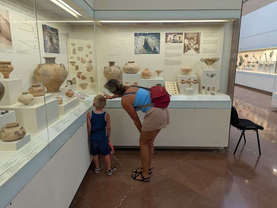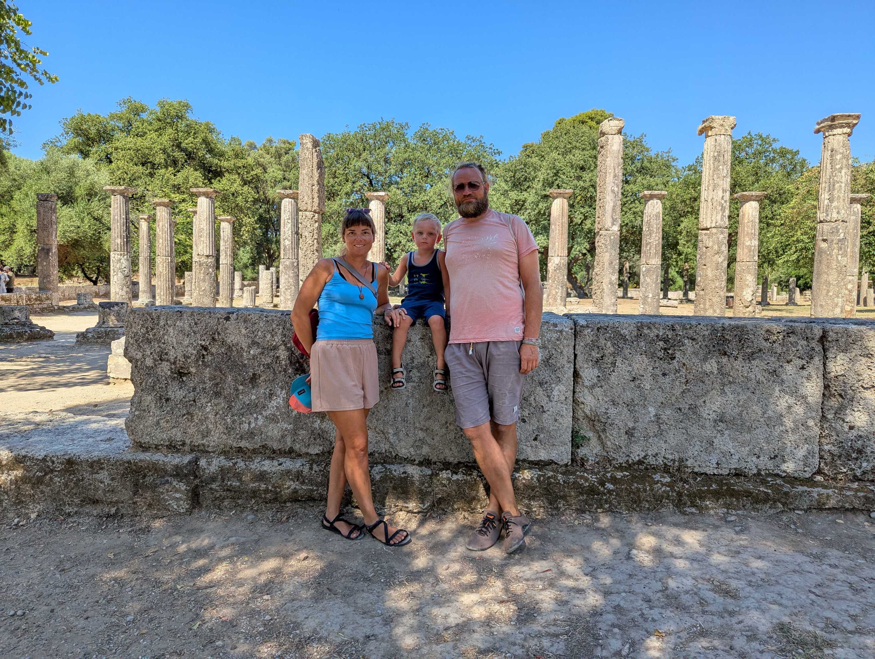 Auch wir nutzen die Gegelenheit um die Ausgrabungen von Olympia zu besichtigen. Es gibt eine Zugverbindung, die uns direkt bis vor die Tore der Ausgrabungsstätte bringt. In brütender Hitze laufen wir über das weitläufige Gelände und bestaunen die antiken Bauwerke beziehungsweise das, was von ihnen übrig geblieben ist. Die klimatisierten Ausstellungsräume verschaffen zwischendurch etwas Abkühlung und präsentieren viele Funde vom Tontopf über Schmuck, Kettenhemden, Helmen bis hin zu riesigen Marmorstatuen. Nach so viel Kulturprogramm sind die Kinder hungrig und die Erwachsenen durstig. Wir kehren in einer der Tavernen ein während wir auf den Zug zurück nach Katakolon warten.