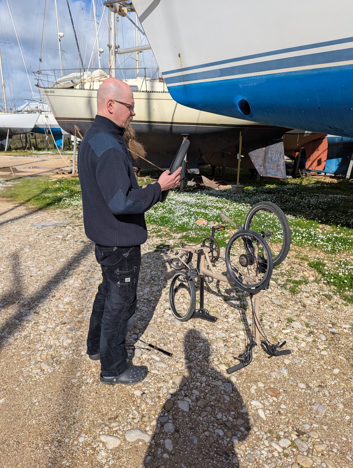 Zeitgleich widmet sich Danny Christophs Brompton Klapprad, das seit den letzten Tagen auf Sizilien stark am Eiern war, weil der hintere Mantel geplatzt war. Den neuen Mantel hatten wir bereits im Sommer nach Preveza schicken lassen, doch der Leidensdruck war bisher nicht groß genug, da wir die Räder ohnehin hauptsächlich im Winterlager benutzen.