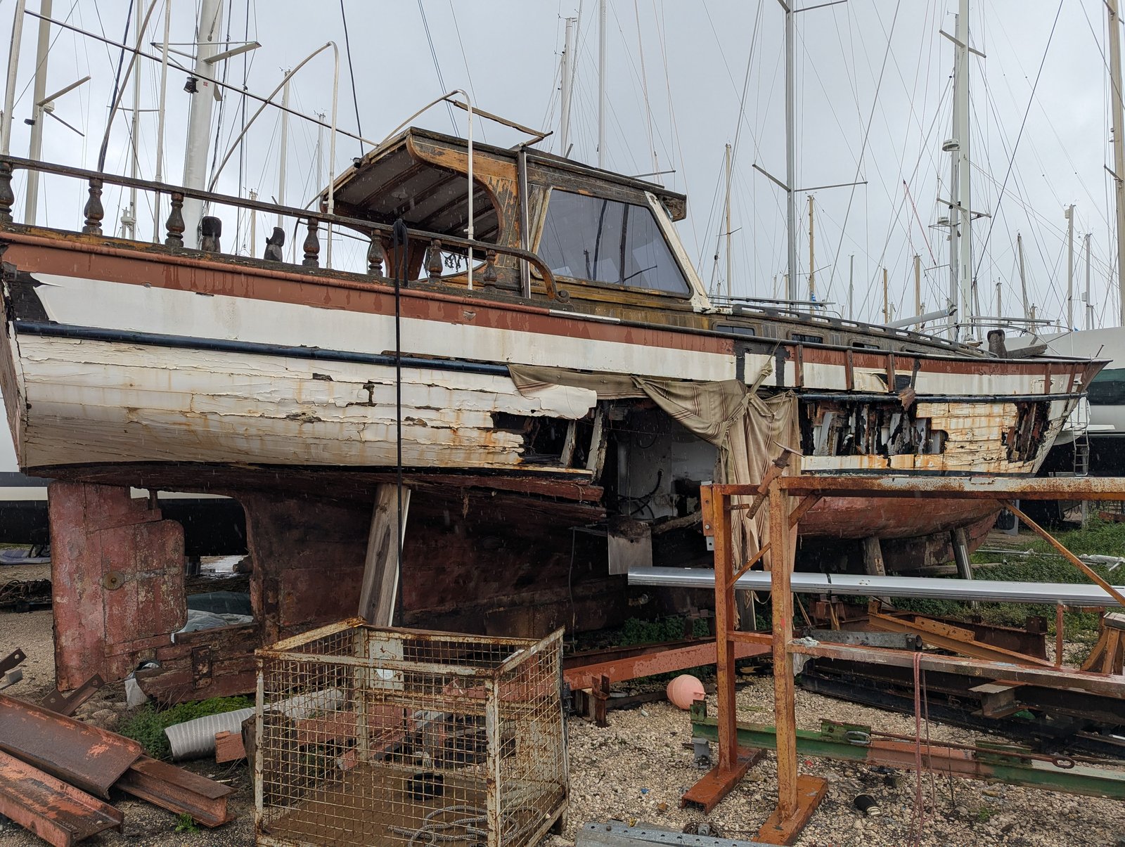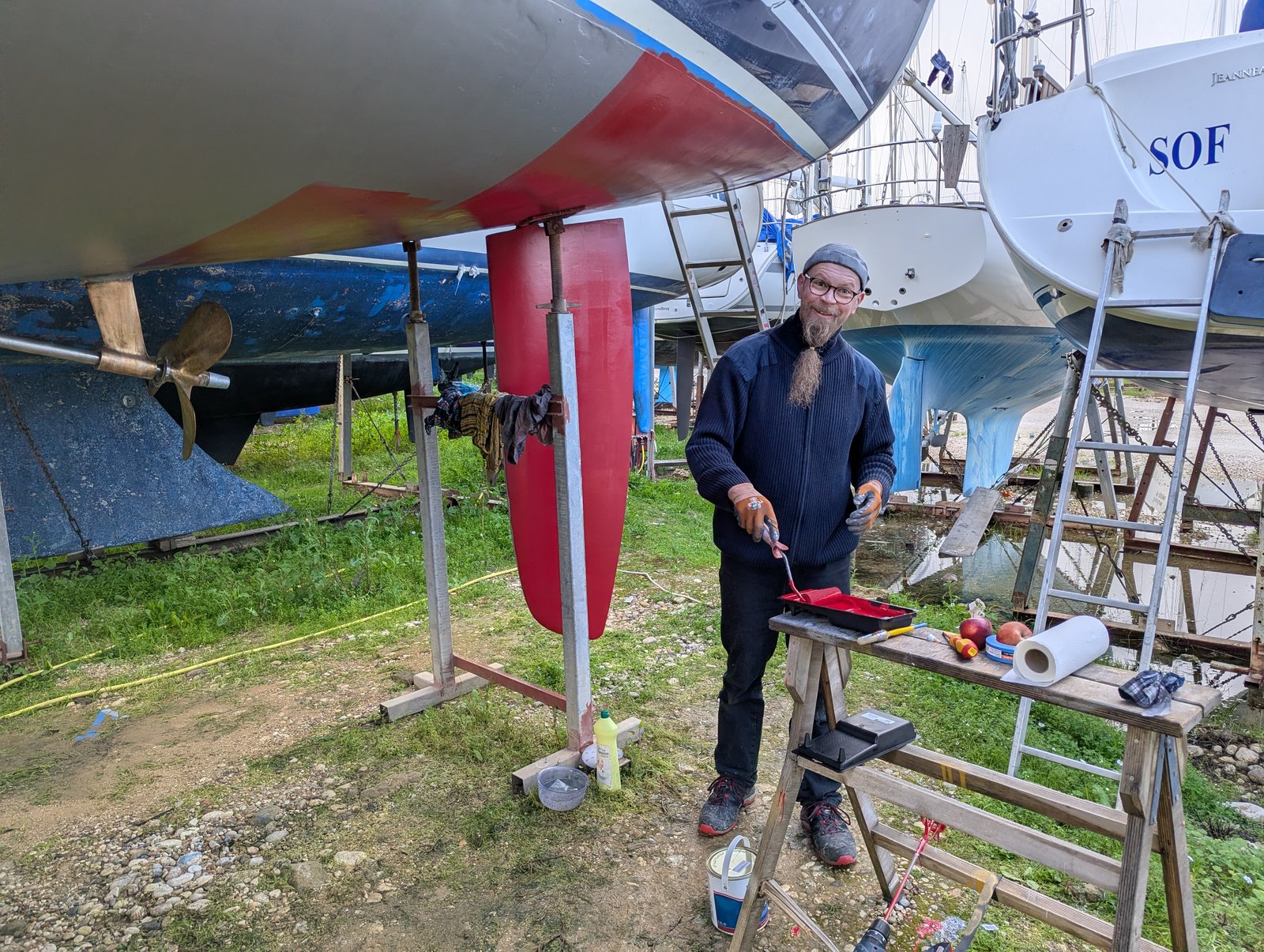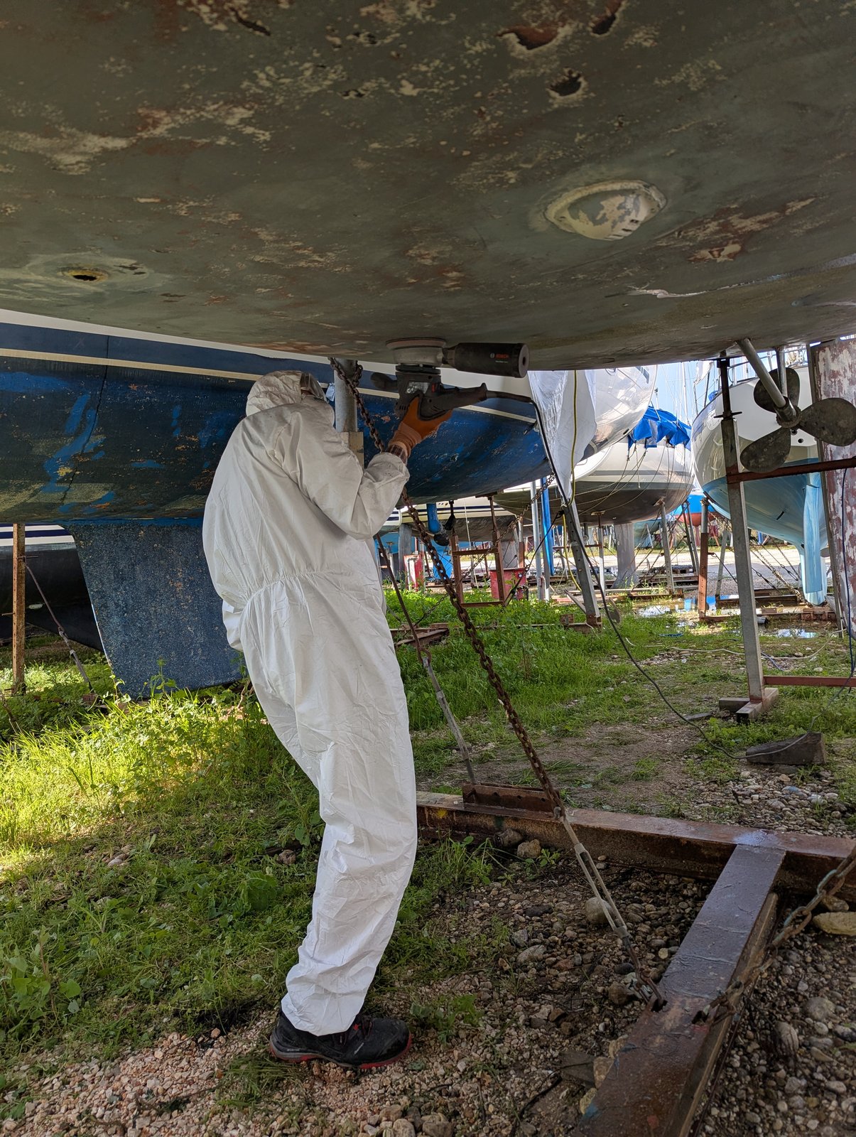 Wir müssen das Unterwasserschiff nur anschleifen und lose Schichten entfernen, bevor wir die erste Schicht Grundierung (Primocon) auftragen können. Da es aktuell nahezu jeden Tag regnet, nutzen wir jede trockene Lücke, um die Arbeiten voranzutreiben. Nach zwei Tagen in der Koje kann auch Danny beim Unterwasserschiff mit einsteigen und freut sich sehr auf das Arbeiten mit der Schleifmaschine.