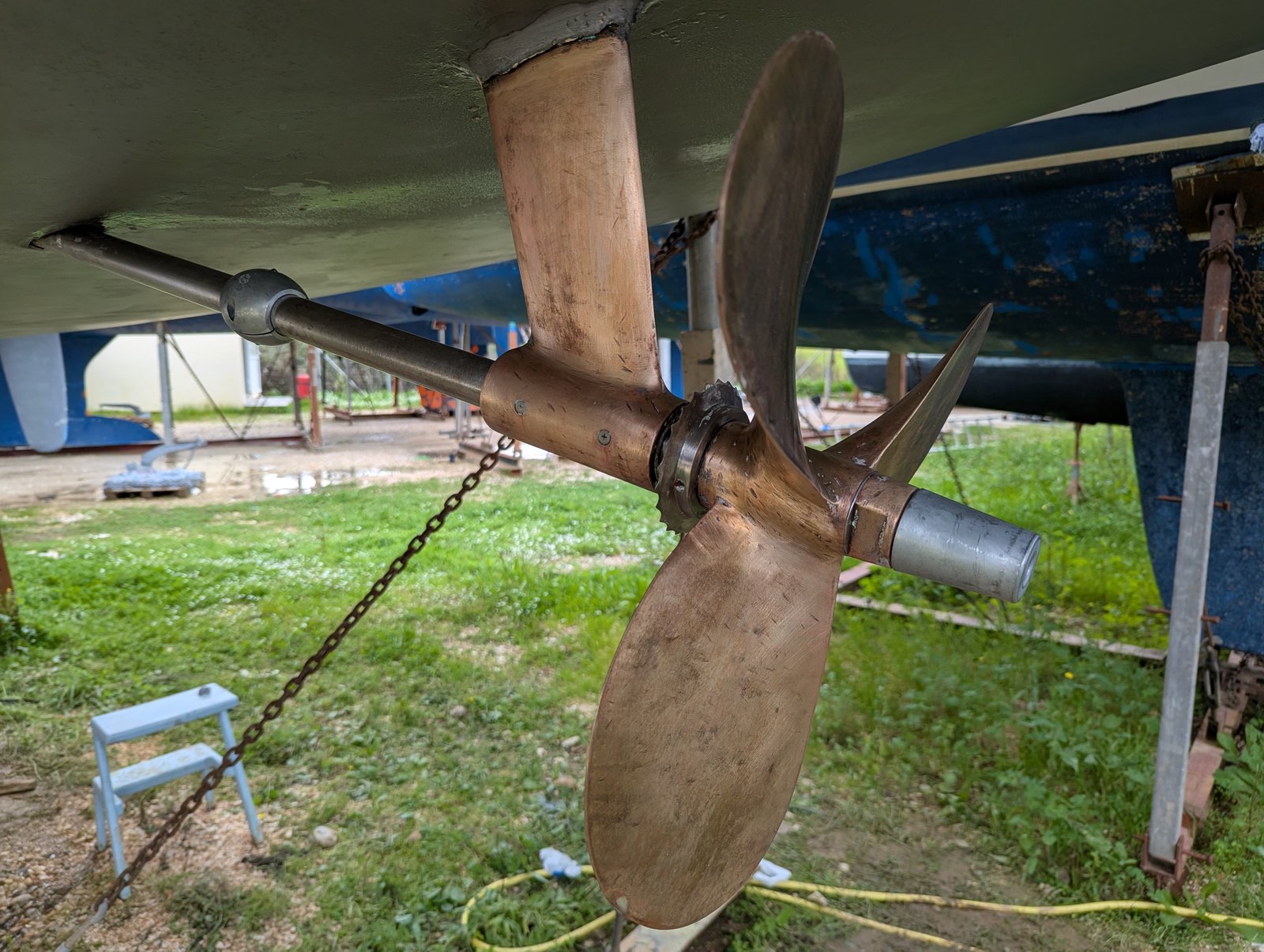 Anschließend folgen jeweils zwei Anstriche mit der Grundierung und Micron 350 Antifouling in knalligem Rot. Dem Propeller und Schaft rücken wir mit Phosphorsäure auf den Leib und bekommen beides wieder schön blank. Außerdem gibt es rundum neue Zinkanoden: Zwei für das Bugstrahlruder steuerbord und backbord, eine für den Schaft und eine für den Propeller. Die alten Anoden am Bugstrahlruder sind jedoch so festgefressen, dass wir sie erst nach mehreren Anläufen und unter Einsatz von Hammer und Meißel gelöst bekommen.