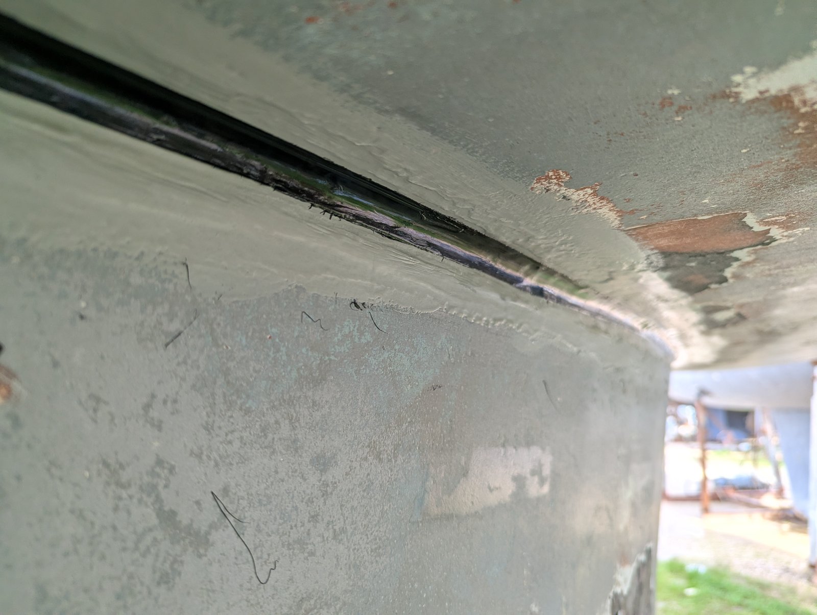 Die alte Kielfuge hängt teilweise schon in Fetzen und muss ebenfalls erneuert werden, und zwar noch, bevor wir an dieser Stelle grundieren können. Mit Drahtbürstenaufsatz für den Akkuschrauber entfernen wir die alten Sikareste bis auf ca 2 cm breite oben und unten der blanke Kiel und das blanke Gelcoat freiliegen. Anschließend werden diese Stellen mit 2-Komponenten Epoxyprimer bestrichen, danach folgt noch ein spezieller Primer für das Sika 291i und schließlich die neue Fuge.