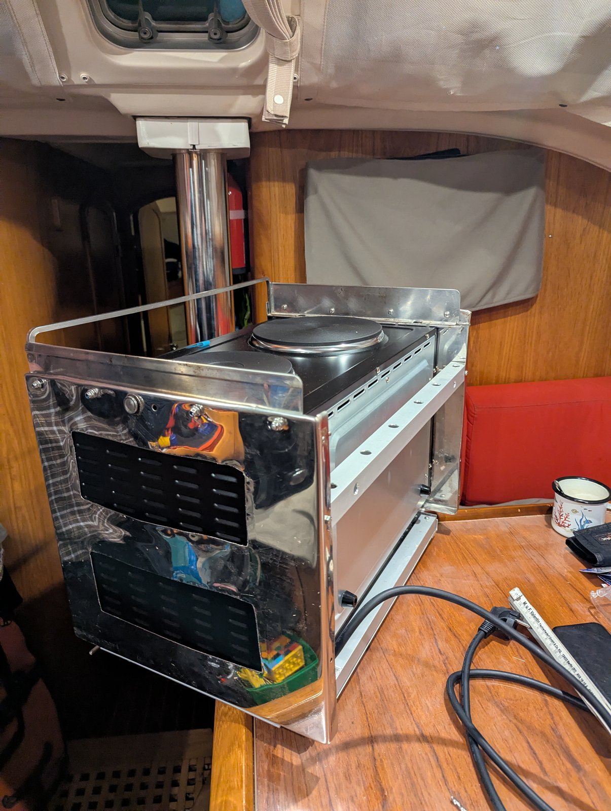 Nach dem ersten gemeinsamen Frühstück entwickeln wir einen Schlachtplan. Der oberste Punkt auf Christophs Wunschliste ist die Umrüstung der Kochfelder und Backofen auf elektrische Geräte. Wie bei Serienyachten üblich, verfügt unsere Wanderer über ein Kombigerät aus Gasofen und Gaskochfeld, welches halbkardanisch aufgehängt ist, sodass es bei Schräglage und Seegang frei schwingen kann, damit die Suppe nicht auf dem Boden landet, sondern im Topf bleibt. Dabei unterstützen zudem die üblichen verschiebbaren Klemmen, die es ermöglichen, Töpfe und Pfannen festzuklemmen, um so ein Verrutschen zu verhindern. Darüber hinaus lässt sich das Gerät auch feststellen, sodass es eben nicht schwingt, wenn das Schwingen gerade nicht erwünscht ist. Diese Eigenschaften sind für das Kochen auf einer Einrumpf-Segelyacht elementar und sollen uns selbstverständlich auch beim elektrischen Kochen weiter erhalten bleiben.
