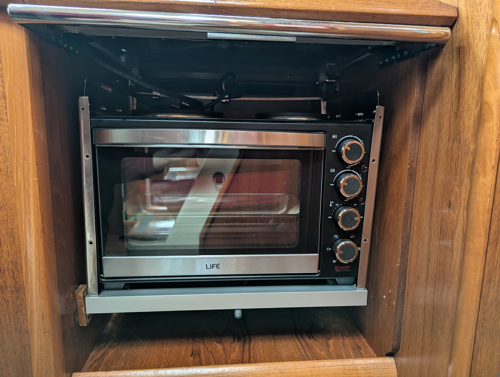 Christoph bleibt mehrere Tage ans Bett gefesselt und muss sich damit begnügen, vom Bett aus zu recherchieren und mitzuplanen. Inzwischen kristallisiert sich heraus, dass es einfacher wäre, gleich einen Backofen mit integrierten Herdplatten zu finden. Ursprünglich hatten wir den Plan, Induktionsfelder zu verbauen. Induktion wäre zwar am effizientesten, doch für die vorgegebenen Maße finden wir schlicht kein Kombigerät mit Induktionsplatten. Außerdem haben wir in der vergangenen Saison auch nur einen ganz einfachen Zweiplattenkocher benutzt – nur eben nicht fest verbaut. In einem lokalen Elektrofachhandel werden wir schließlich fündig: ein Kombigerät, das alle unsere Anforderungen erfüllt und gerade so in den zur Verfügung stehenden Platz passt.