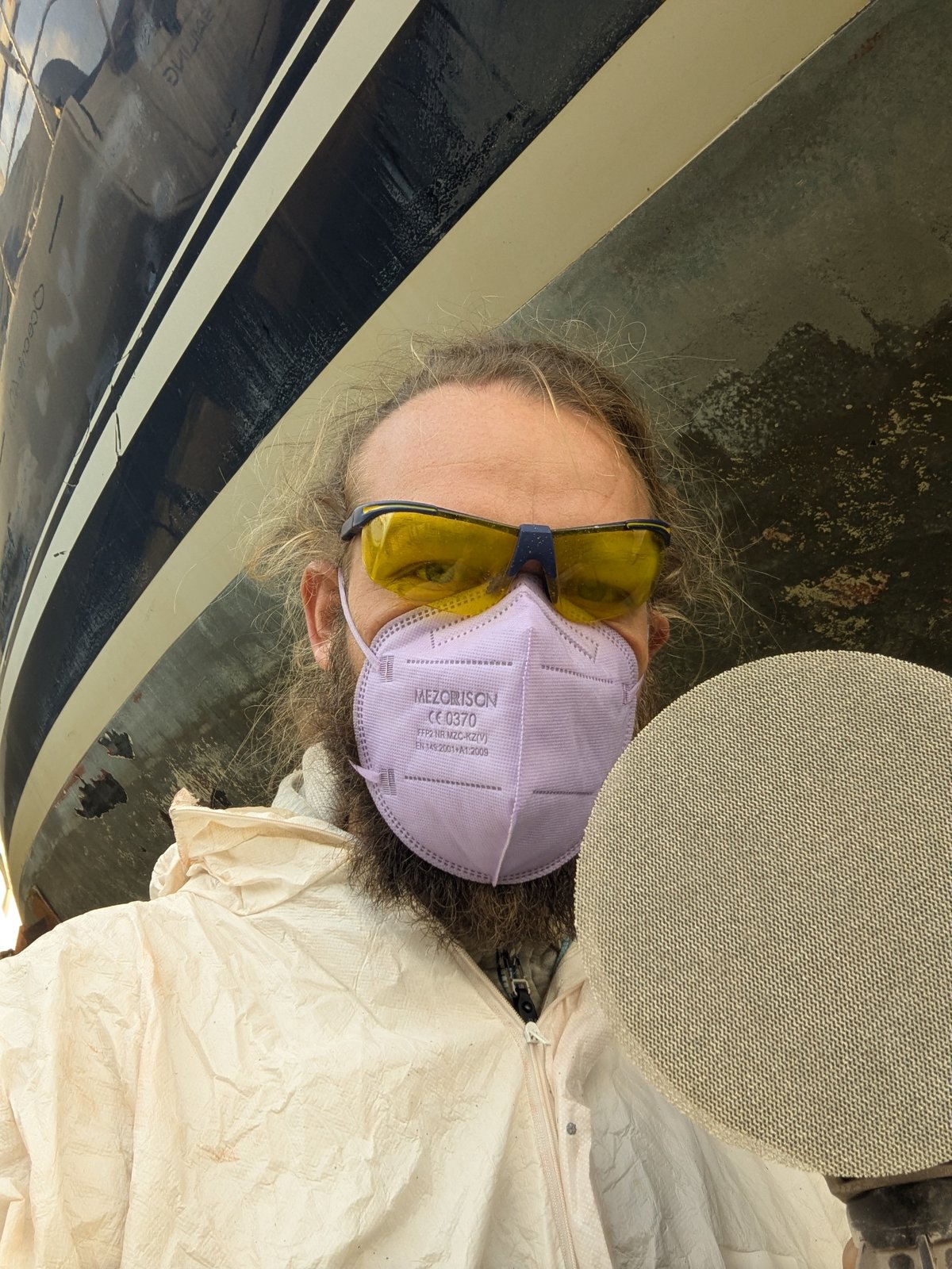 Inzwischen sind die Bazillen weitergezogen und haben Danny befallen. Für zwei Tage fällt er aus, während Christoph inzwischen wieder genug Energie hat, um sich mit der Schleifmaschine dem Unterwasserschiff zu widmen. Eine Arbeit, die schmutzig ist und nur mit Ganzkörperanzug und Schutzmaske zu erledigen ist.