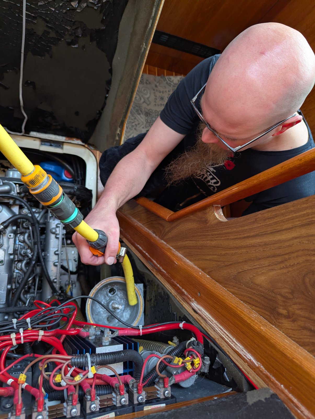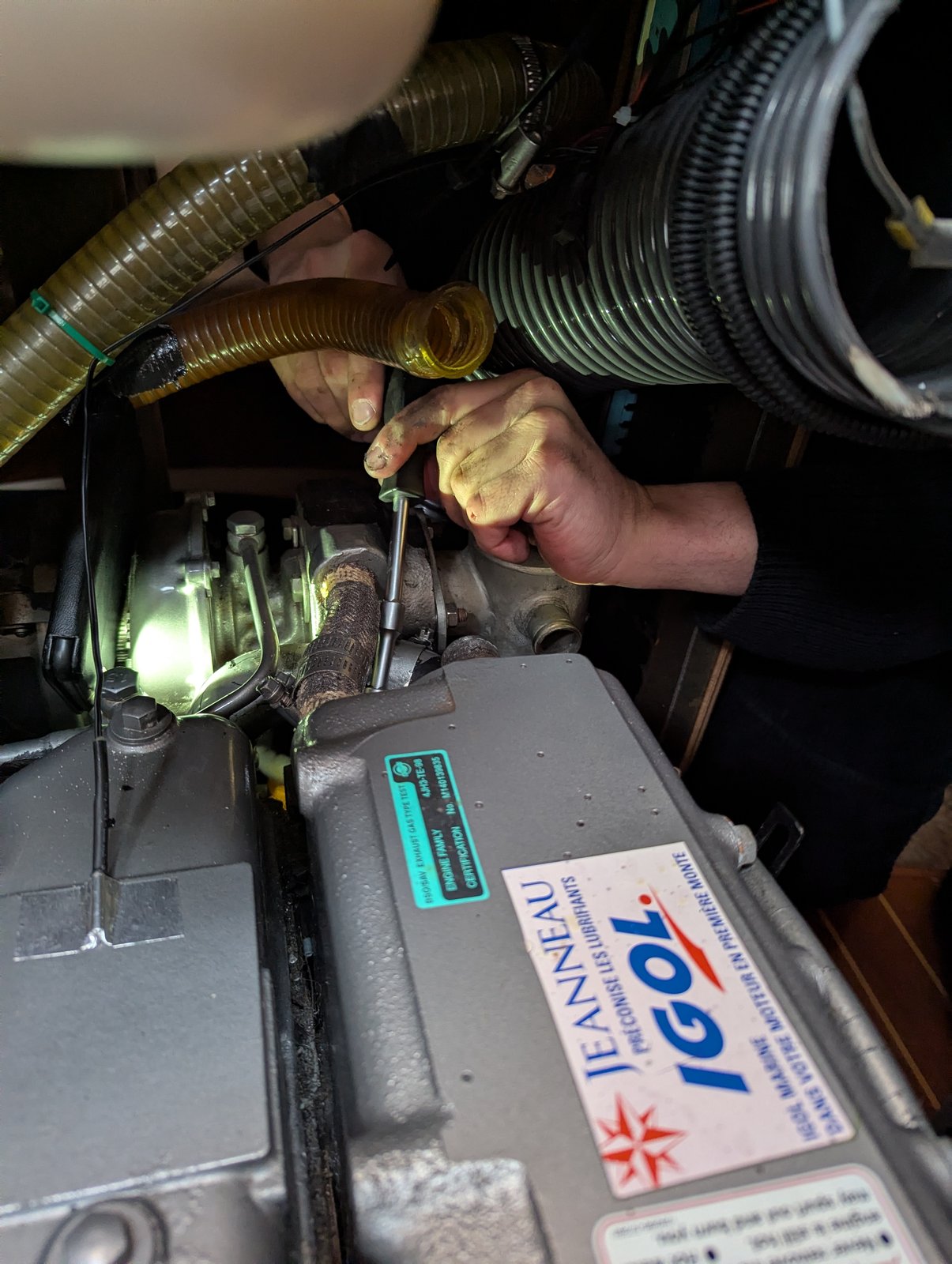 Bevor wir mit der eigentlichen Arbeit beginnen können, müssen wir den Motor an Land laufen lassen können – denn der benötigt im Betrieb Wasser zur Kühlung, das er normalerweise direkt aus dem Meer ansaugt. Die professionelle Lösung wäre eine Manschette, die von außen über die Ansaugöffnung gestülpt und per Schlauch mit einem Wasserhahn verbunden wird. Leider bekommen wir so eine Manschette bei den örtlichen Schiffsausstattern weder zu kaufen noch zu mieten. Wir greifen daher auf die Methode zurück, die wir bereits zum Einwintern mit Frostschutz benutzt haben: Nur statt einer Gießkanne stecken wir jetzt einen Gartenschlauch direkt in den Wasserfilter, sodass der Motor während des Betriebs kontinuierlich mit Wasser versorgt wird. Mit ein bisschen Koordination gelingt es uns so, den Motor mit ruhigem Gewissen an Land laufen zu lassen.