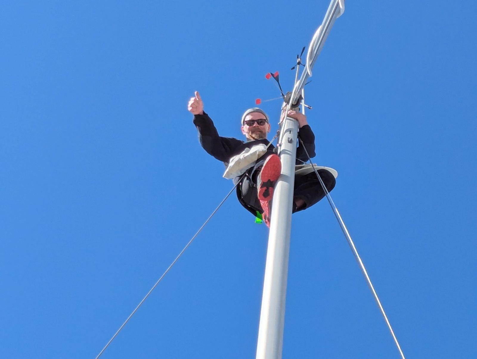 Mit Baumpflegergurt und doppelter Absicherung über die Dirk und das Spi-Fall zieht Christoph Danny über die E-Winsch bis hoch zum Masttop. Natürlich sind die Schrauben der alten TV-Antenne festgegammelt, doch mit etwas Geduld verabschiedet sich das alte Ding und gibt den Platz frei für den neuen Windex. Nach einer guten halben Stunde ist Danny zurück am Boden und wir schließen das letzte Projekt für diese Saison ab.