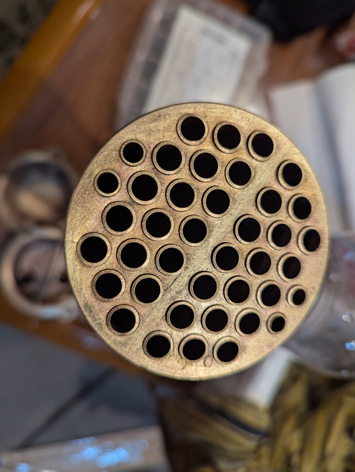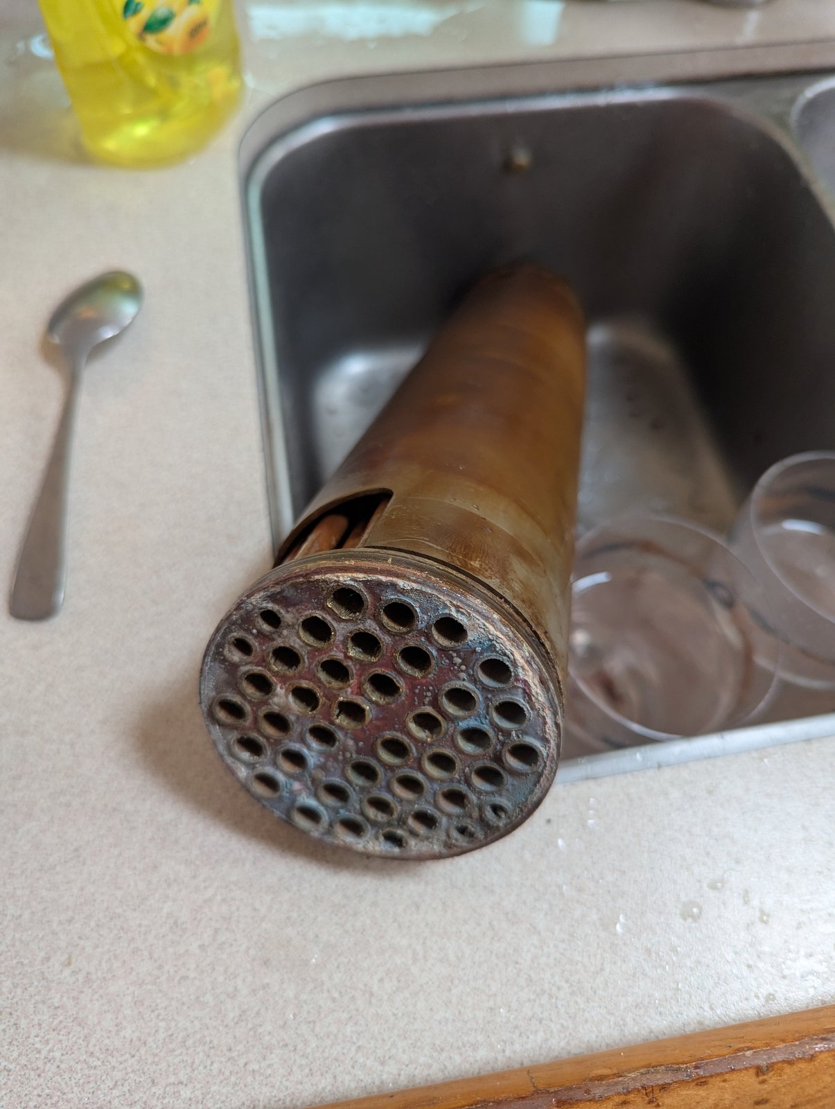 Für die Reinigung besorgen wir uns einen großen Blumenkübel, den wir mit einem Wasser-Säuregemisch befüllen und das Rohrbündel über Nacht darin einweichen lassen. Das Ganze beginnt sofort zu blubbern wie in einem Hexenkessel. Mit Holzspießen und Drahtbürste bearbeitet sieht das Rohrbündel am nächsten Tag wieder aus wie neu.